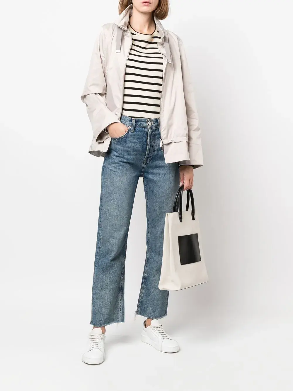 Серо-бежевый, затягивающийся на шнурок капюшон, застежка на молнии спереди, длинные рукава, два прорезных кармана сбоку и вставки.