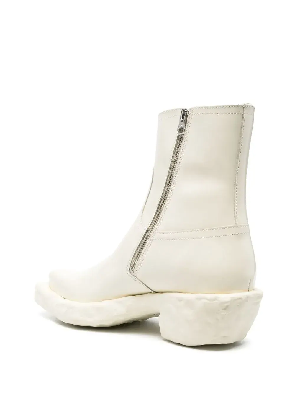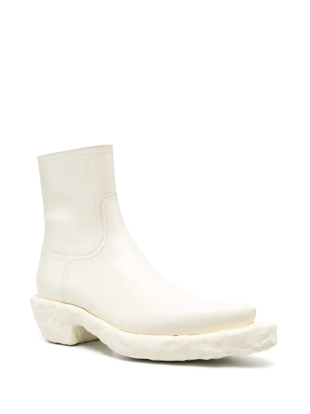 Белый, телячья кожа, переработанный полиэстер, строчка в тон, застежка на молнии сбоку, подошва на платформе, кубинский каблук, заостренный носок и высота по щиколотку.