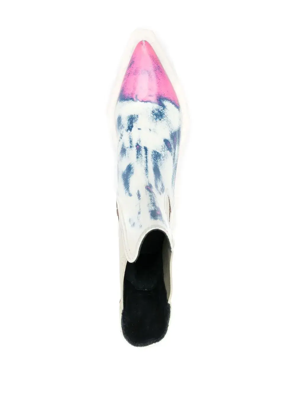 Белый, разноцветный, эффект потертости, заостренный носок, эластичные боковые панели, модель без застежки, длина по щиколотку, плоская резиновая подошва и низкий блочный каблук.