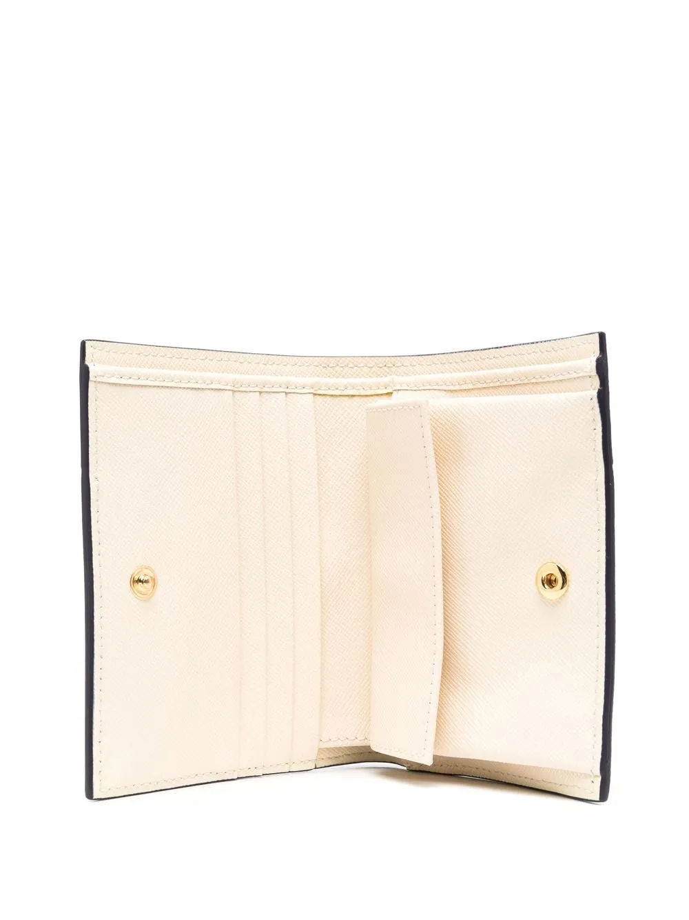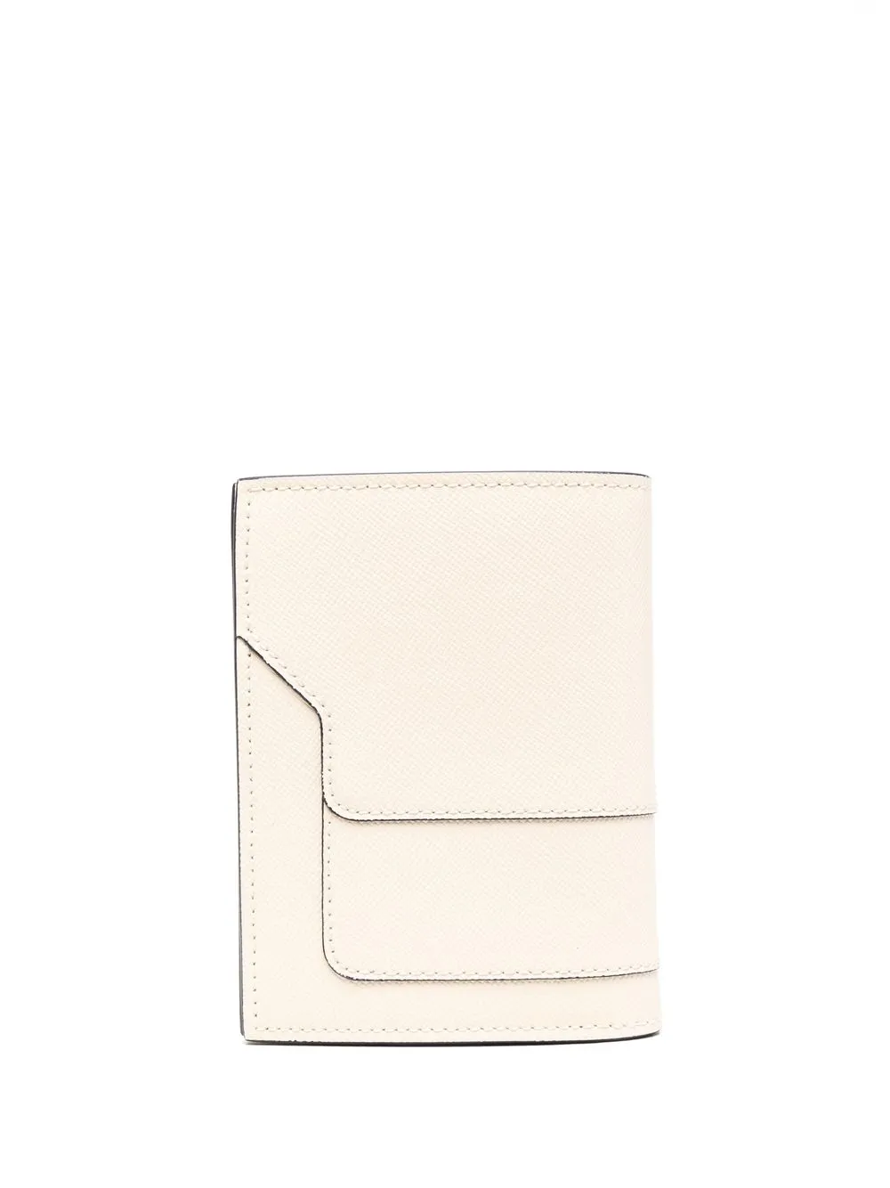 Бежевый, кожа, хлопок, зернистая текстура, тисненый логотип спереди, золотистая фурнитура, отделение для купюр, внутренние отделения для карт, отделение для монет, подкладка из хлопка и два сложения.