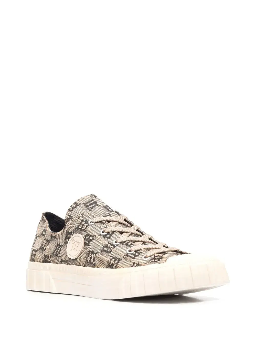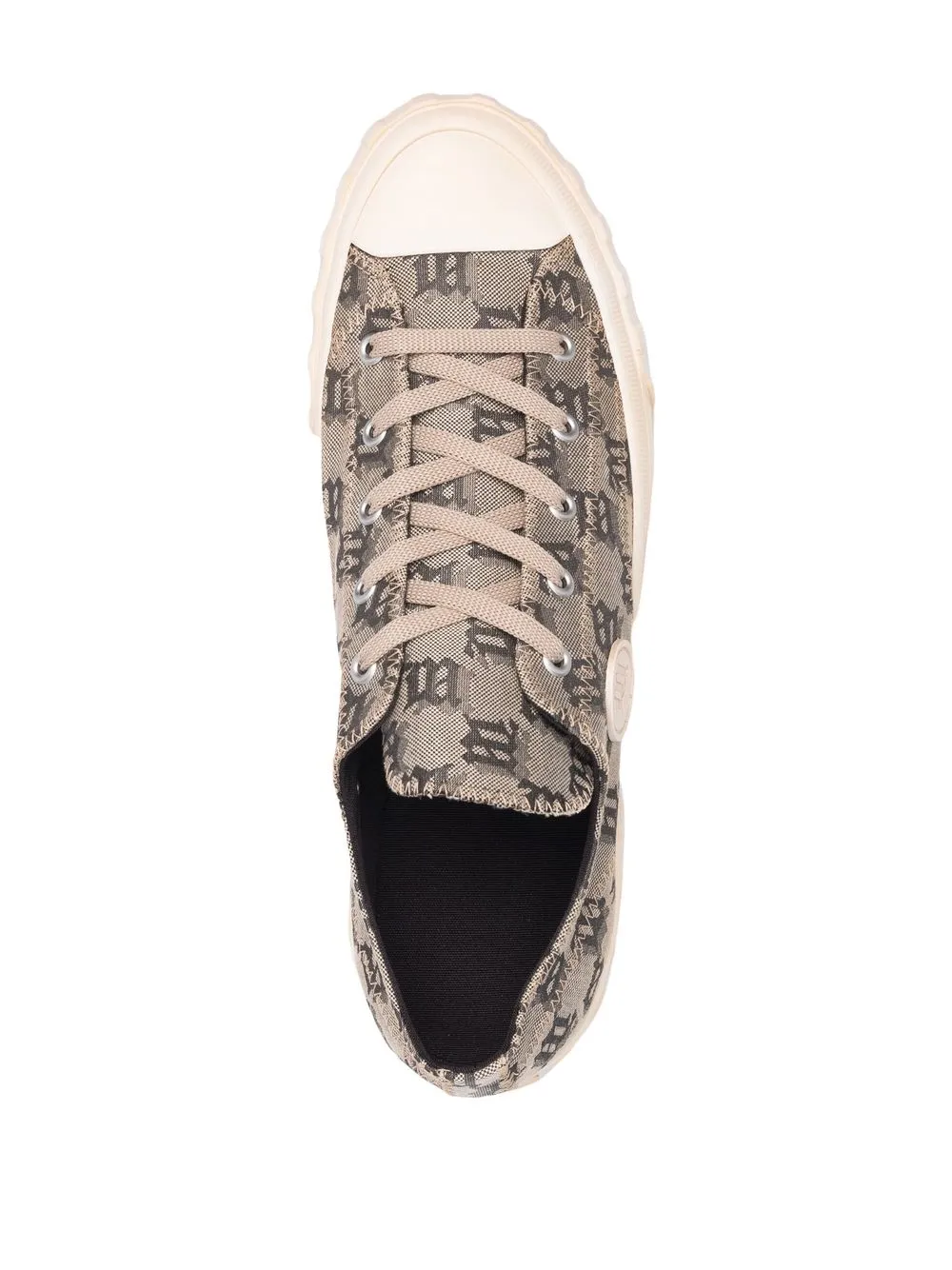 Бежевый, узор с изображением монограммы, нашивка с логотипом сбоку, шнуровка спереди, закругленный носок и плоская резиновая подошва.
