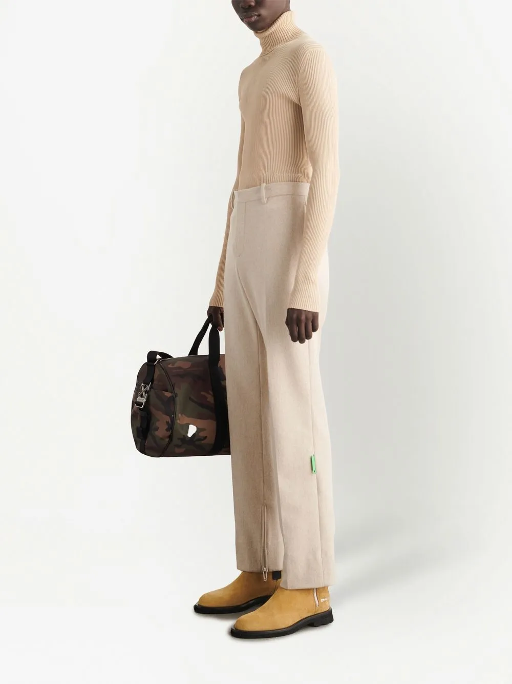 Бежевый, смесовая необработанная шерсть, бирка с логотипом, завышенная талия, потайная застежка спереди, петли для ремня, узкий крой и молнии на манжетах.