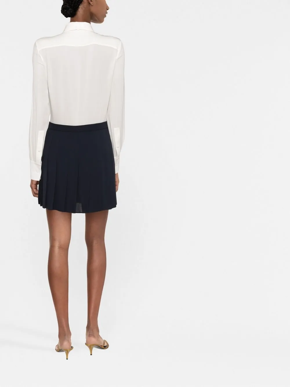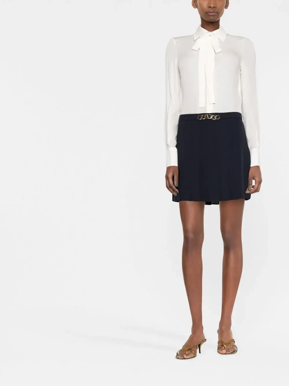 Золотистая фурнитура, знаковый декор Horsebit, воротничок с бантом, планка на пуговицах спереди, круглый вырез, длинные рукава, манжеты на пуговицах, длина выше колена и прямой подол.