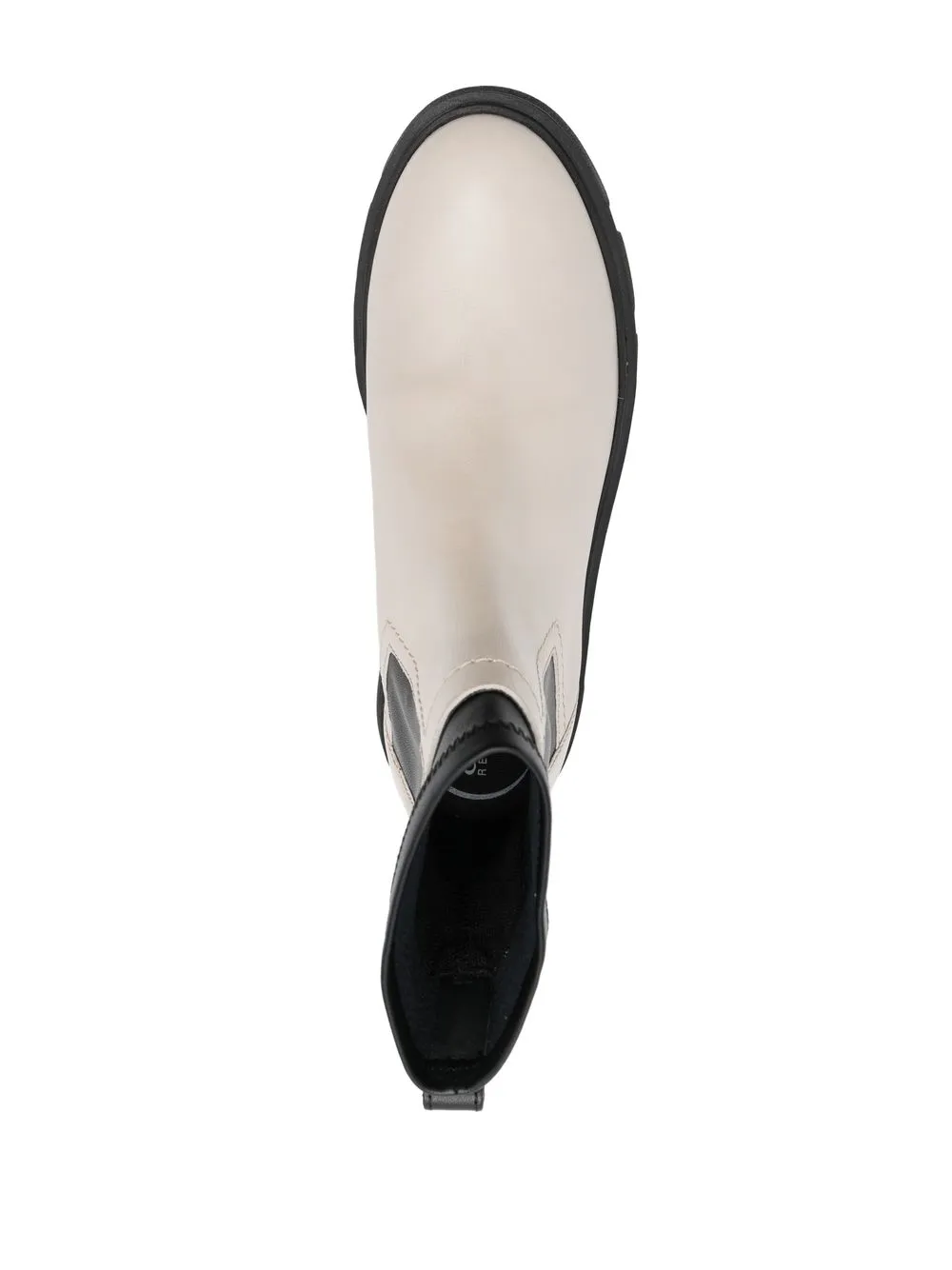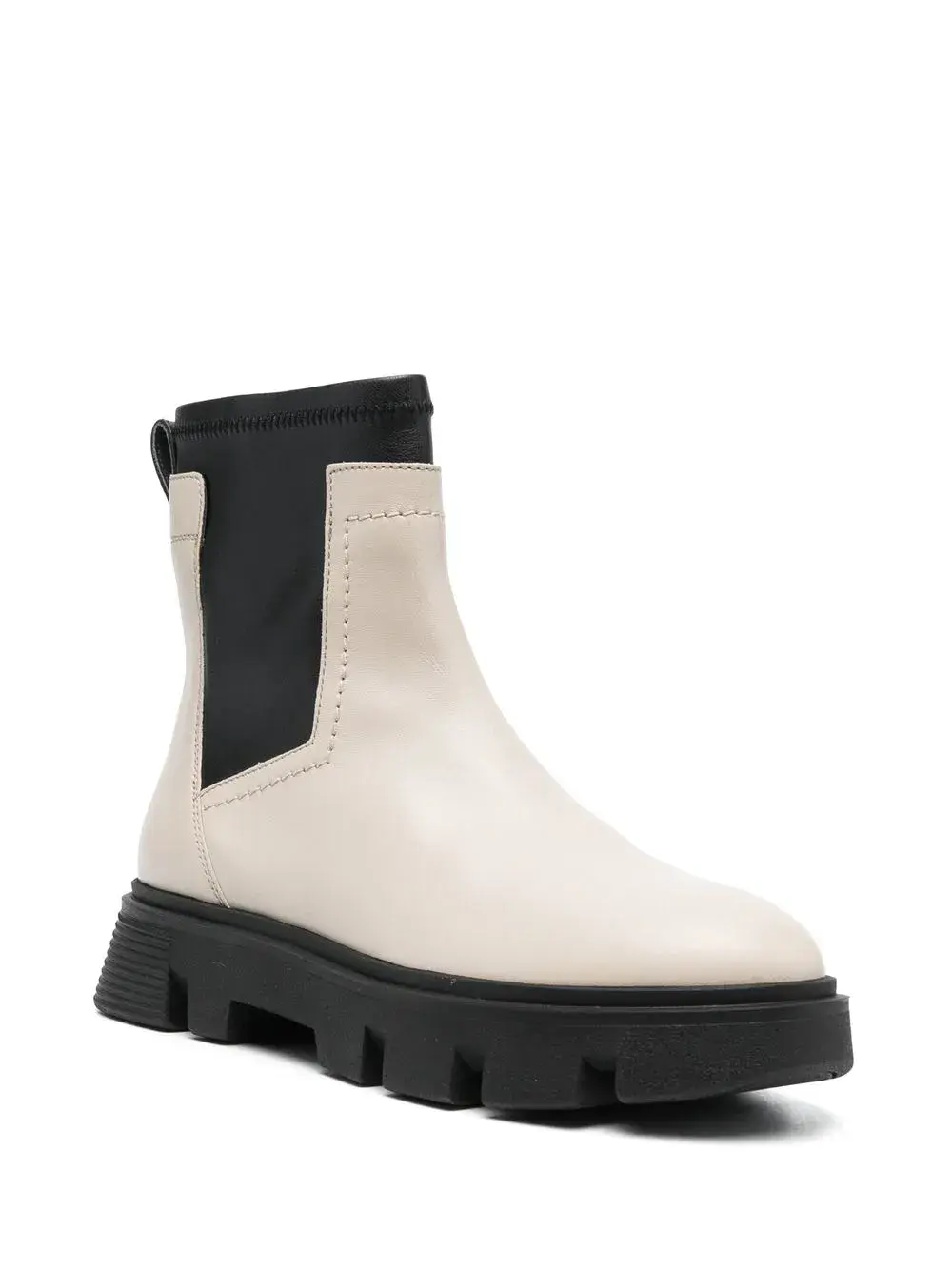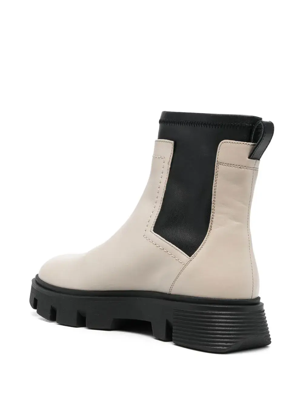 Кремово-белый, телячья кожа, закругленный носок, шнуровка спереди, плоская подошва и высота по щиколотку.