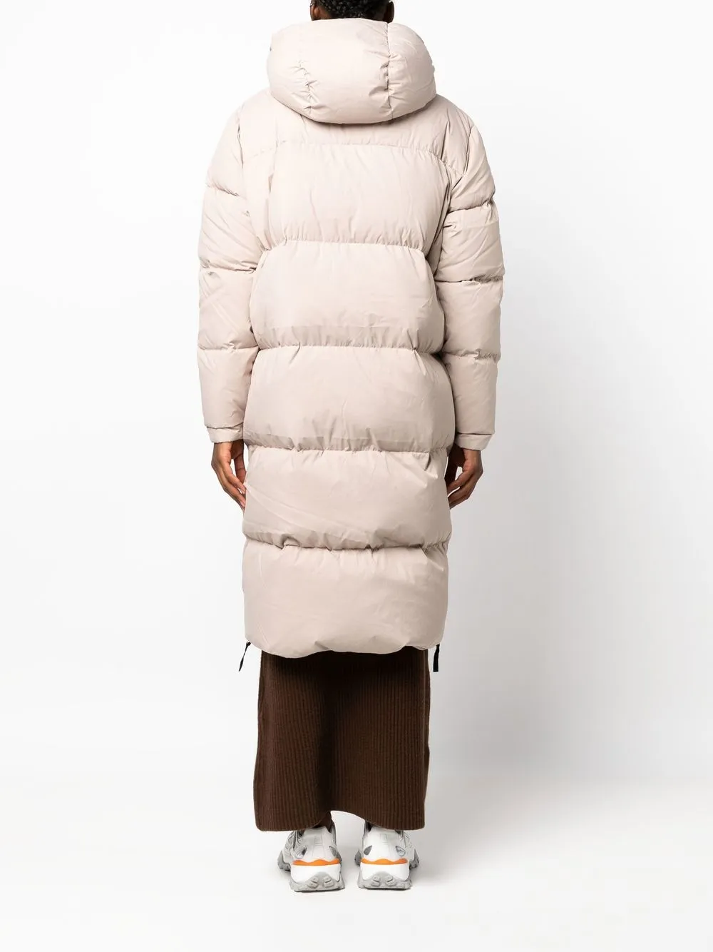 Бежевый, наполнитель из пуха и перьев, принт с логотипом на груди, затягивающийся на шнурок капюшон, высокий воротник, застежка на молнии спереди, два прорезных кармана по бокам, длинные рукава, прямой подол и длина миди.