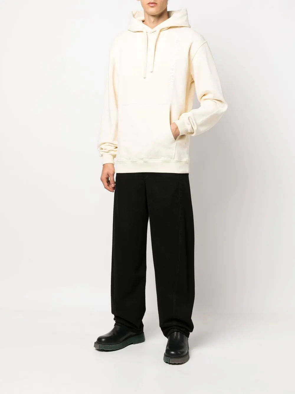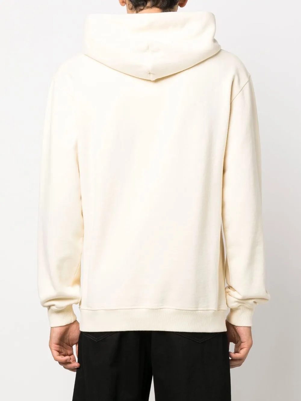 Экрю, органический хлопок, вышитый логотип на груди, однотонная расцветка, затягивающийся на шнурок капюшон, длинные рукава и прямой подол.