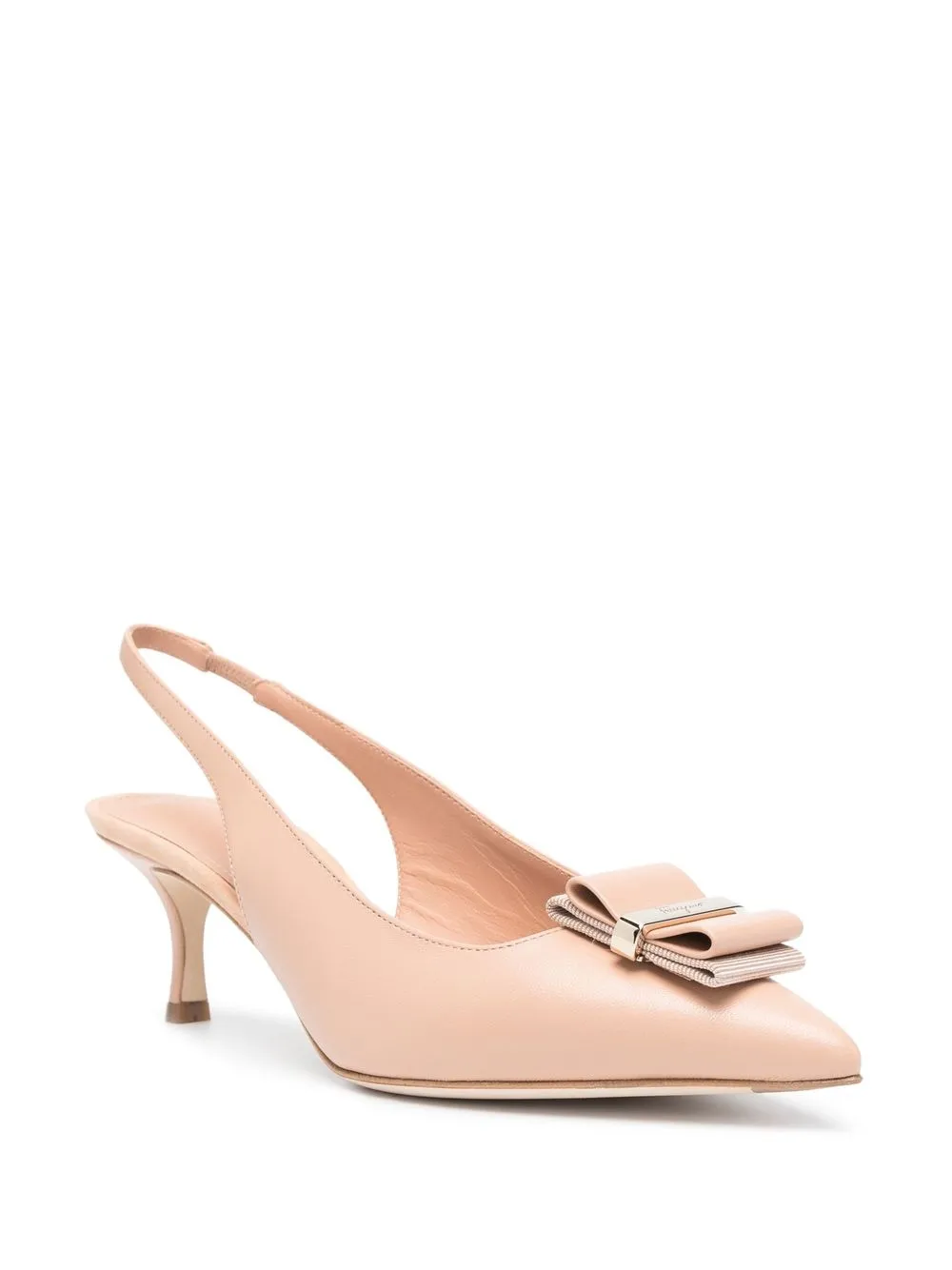 Бежевый, телячья кожа, заостренный носок, бант, эластичный ремешок на пятке и каблук в форме конуса средней высоты.