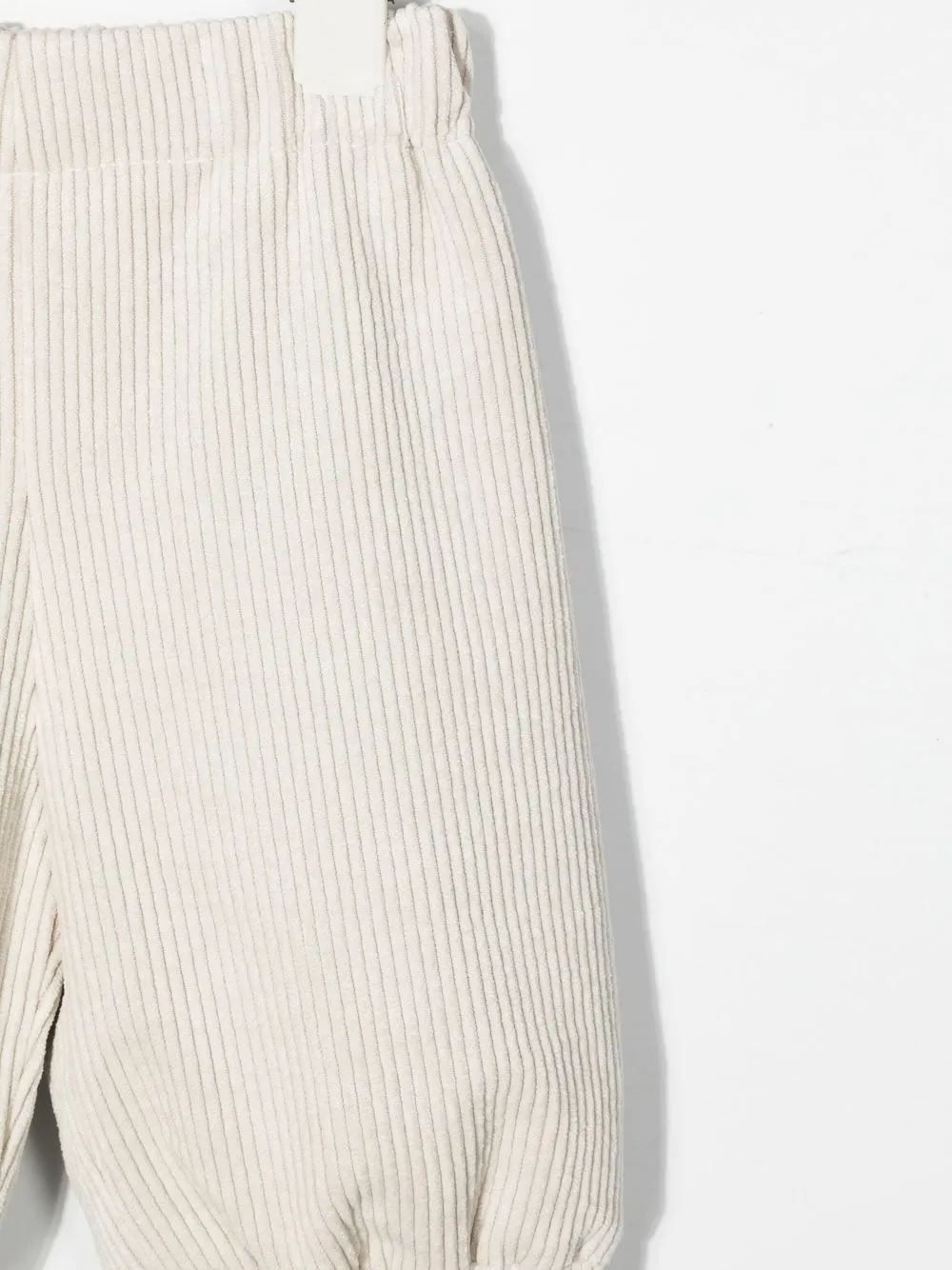 Кремовый, эластичный пояс, зауженный крой и эластичные манжеты.