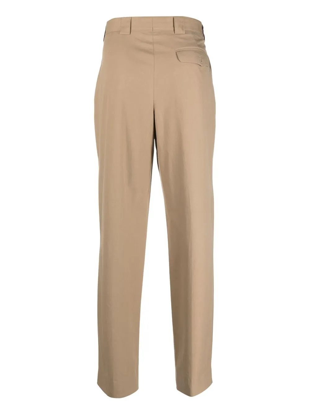 Бежевый, хлопок, складки, петли для ремня, застежка на молнии и пуговице спереди, прямой крой, два прорезных кармана по бокам и карман с клапаном сзади.
