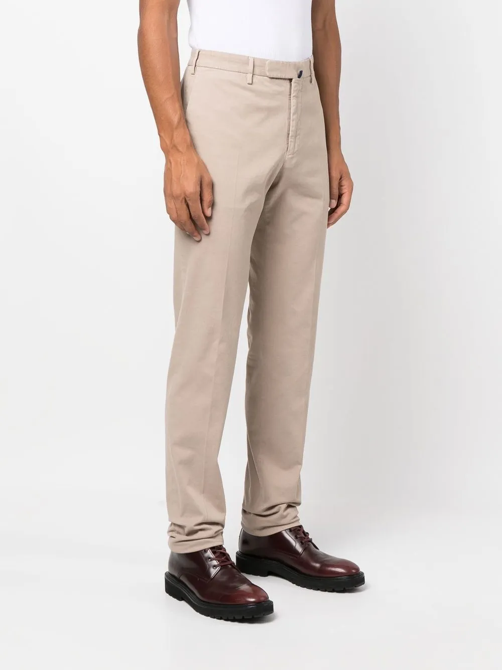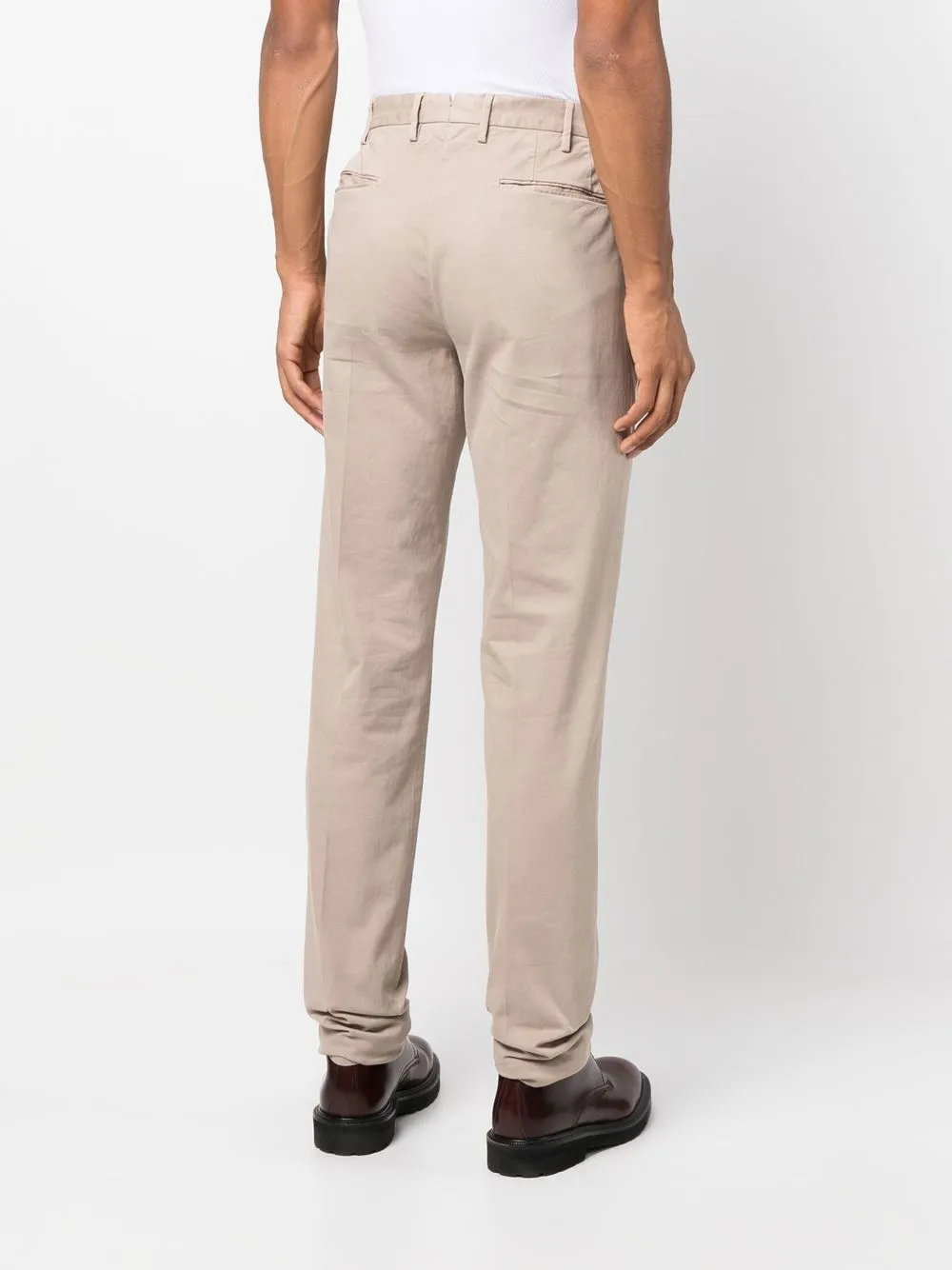 Светло-бежевый, эластичный хлопок, металл с покрытием, строгий крой, отделка лентой, пояс с прорезями, стрелки, застежка на молнию и крючок, прямой крой, два кармана по бокам, два прорезных кармана сзади и петли для ремня.