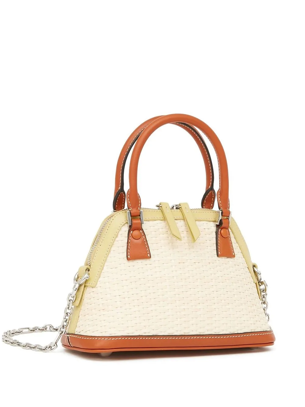 Кремово-белый, коричневый, рафия, телячья кожа, хлопок, нашивка с логотипом спереди, плетеный дизайн из рафии, две верхние ручки, ремешок-цепочка на плечо, ремешок-цепочка на плечо, двусторонняя молния, основное отделение и цельная подкладка.