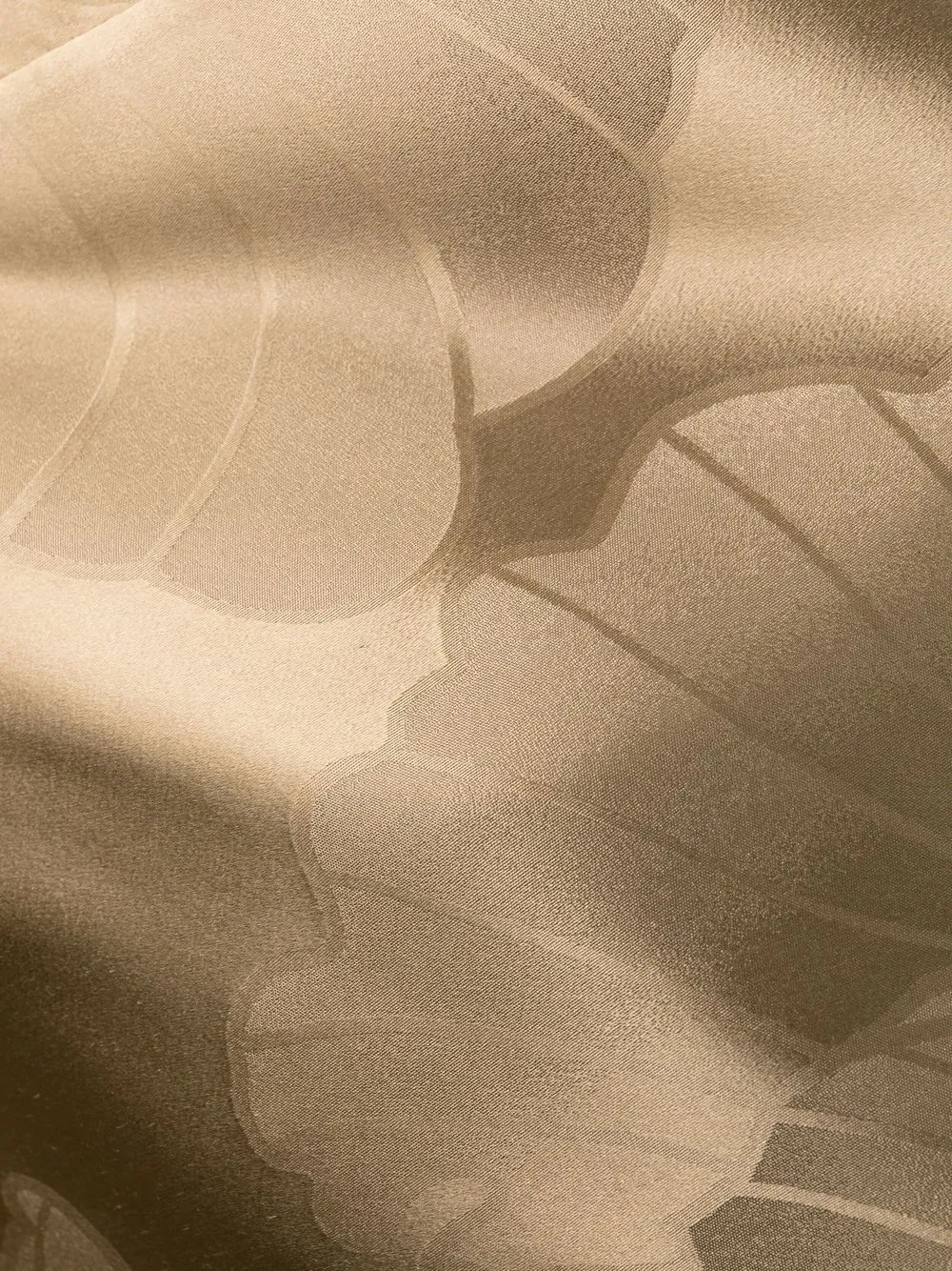 Желтое золото, шелк, жаккардовая модель, модель без застежки, длинные рукава, кулиска на талии и прямой подол.