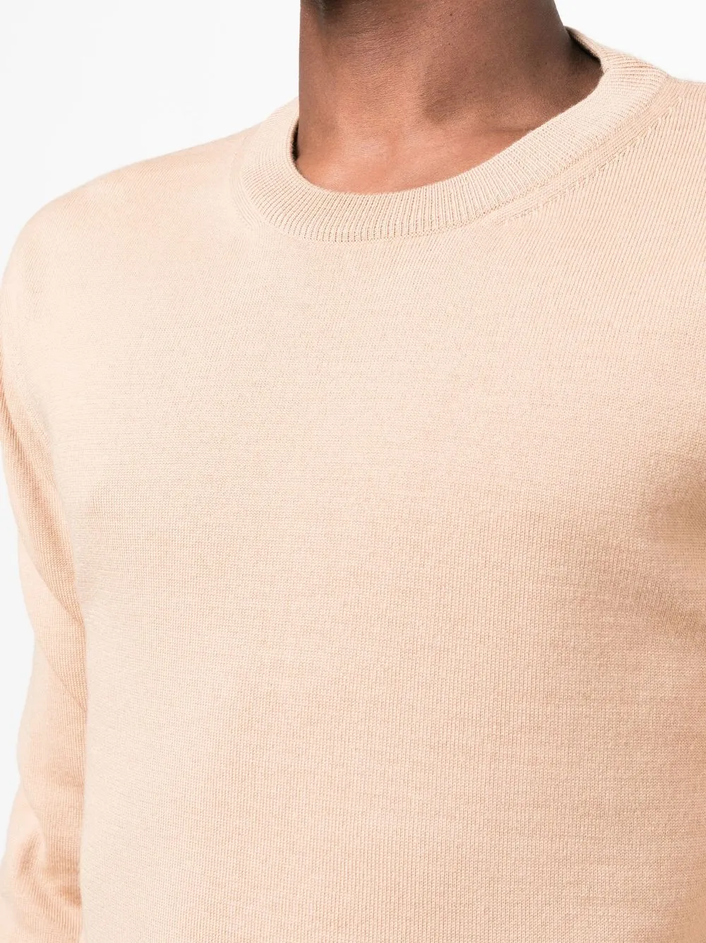 Бежевый, шерсть, круглый вырез, длинные рукава и подол в рубчик.