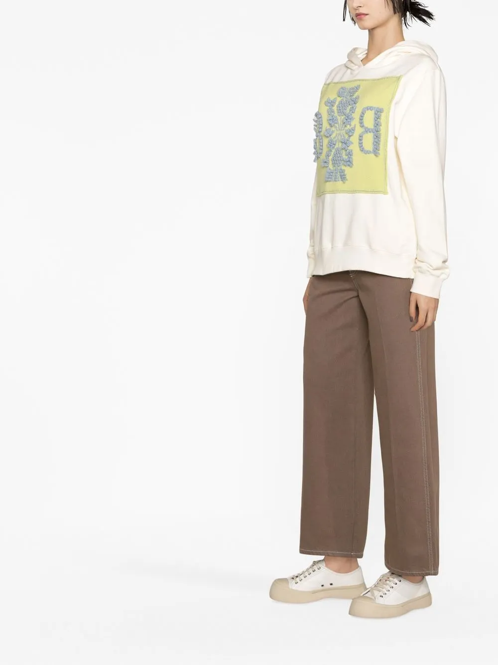 Бежевый, светло-желтый, голубой, хлопок, нашивка с логотипом спереди, вышивка, классический капюшон, длинные рукава и прямой подол.