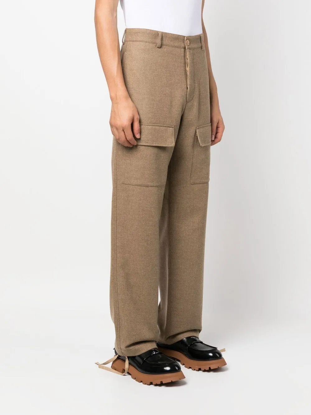 Светло-бежевый, нашивка с логотипом сзади, петли для ремня, застежка на молнии и пуговице спереди, два прорезных кармана по бокам, два кармана карго спереди, два кармана с клапанами сзади, прямой крой и манжеты с кулиской.
