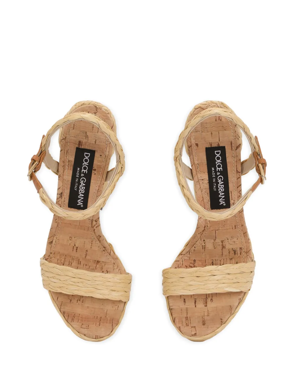 Бежевый, рафия, ремешок на щиколотке с пряжкой, плетеная платформа из рафии, открытый носок и высокий блочный каблук.
