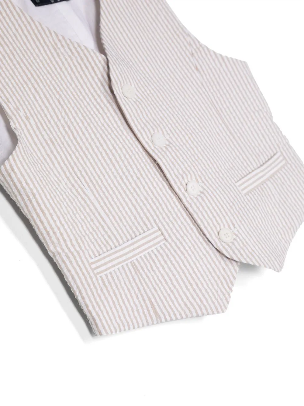 Бежевый, хлопок, жатый эффект, узор в вертикальную полоску, два передних кармана с листочкой, без рукавов, вставка со сборками и закругленный подол.