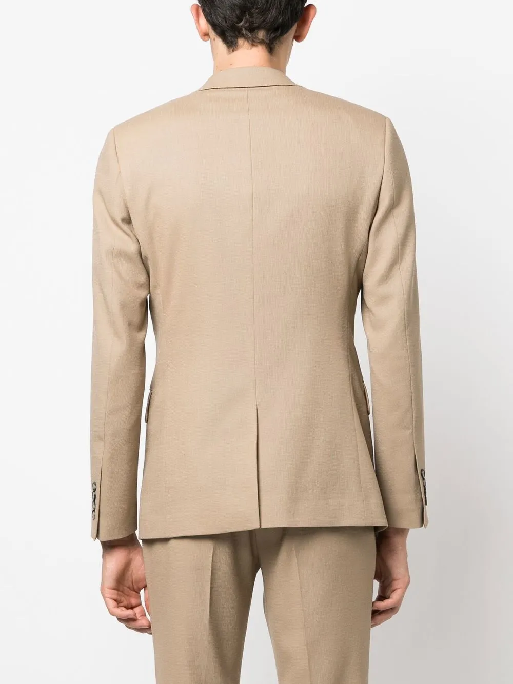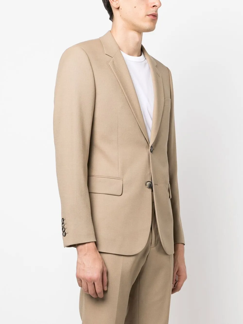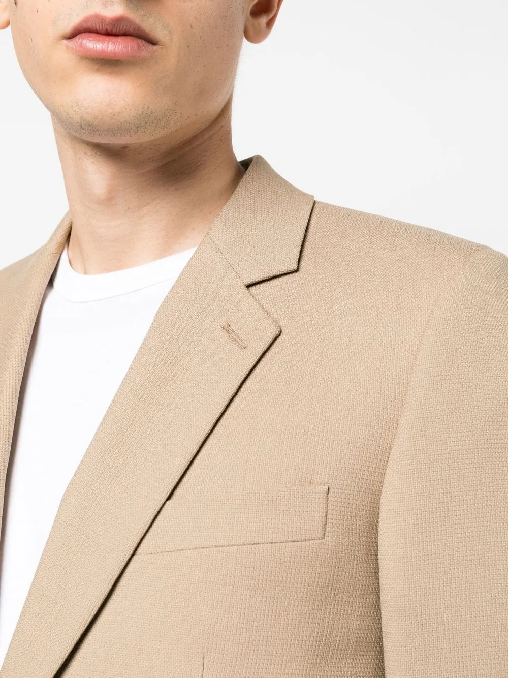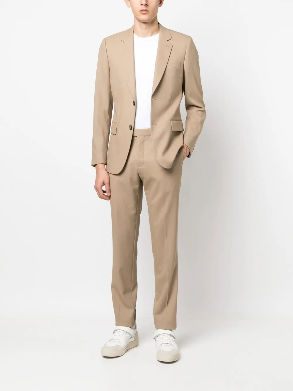 Бежевый, эластичная шерсть, строгий крой, застежка на пуговицах спереди, прорезной карман на груди, два передних кармана с клапанами, длинные рукава, манжеты на пуговицах и прямой подол.