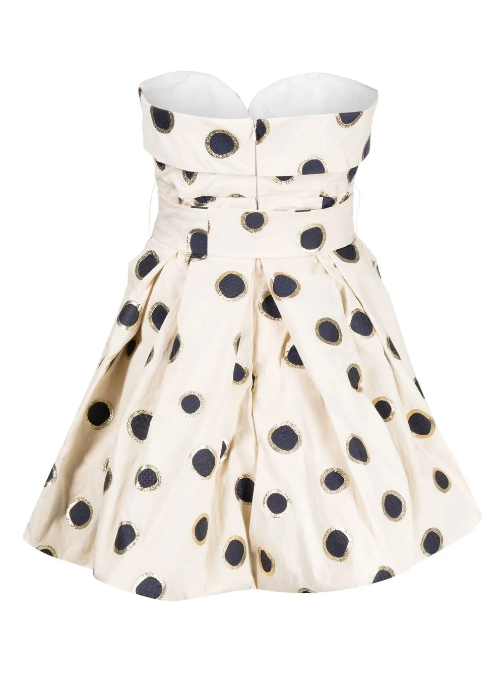 Бежевый, темно-синий, эффект металлик, вышивка с узором в горох, бант, вырез в форме сердца и без бретелей.