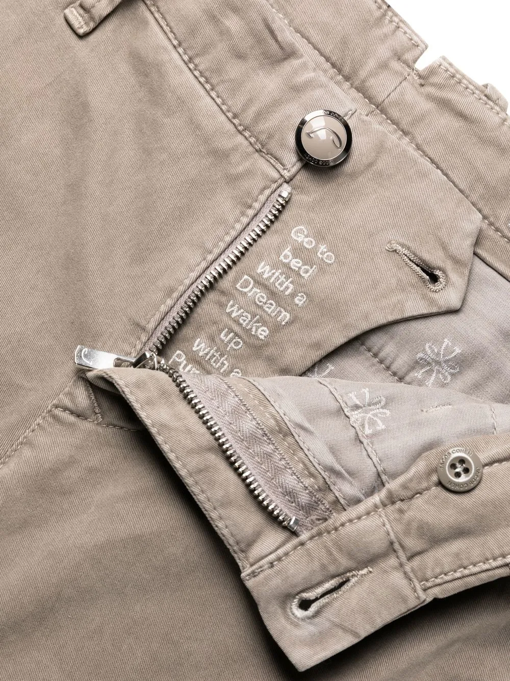 Бежевый, эластичный хлопок, застежка на пуговицах спереди, петли для ремня, узкий крой и два кармана на пуговице сзади.