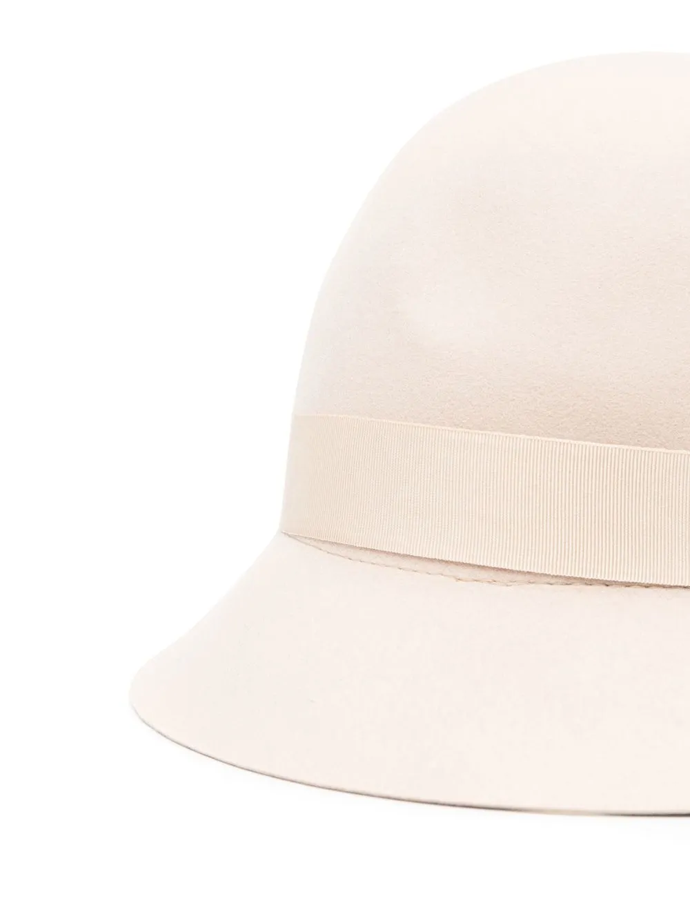 Экрю, шерстяной фетр, эластичный материал, отделка корсажной лентой, круглая тулья и узкие опущенные поля.