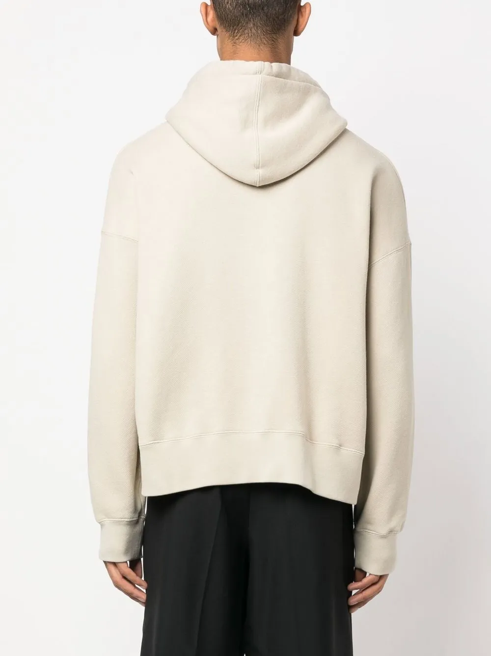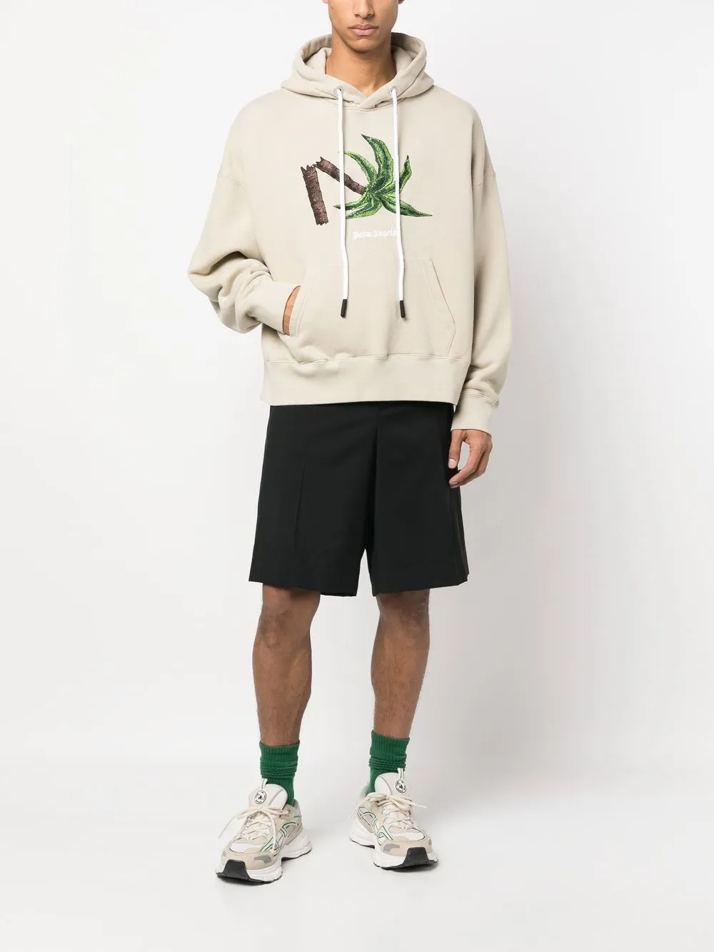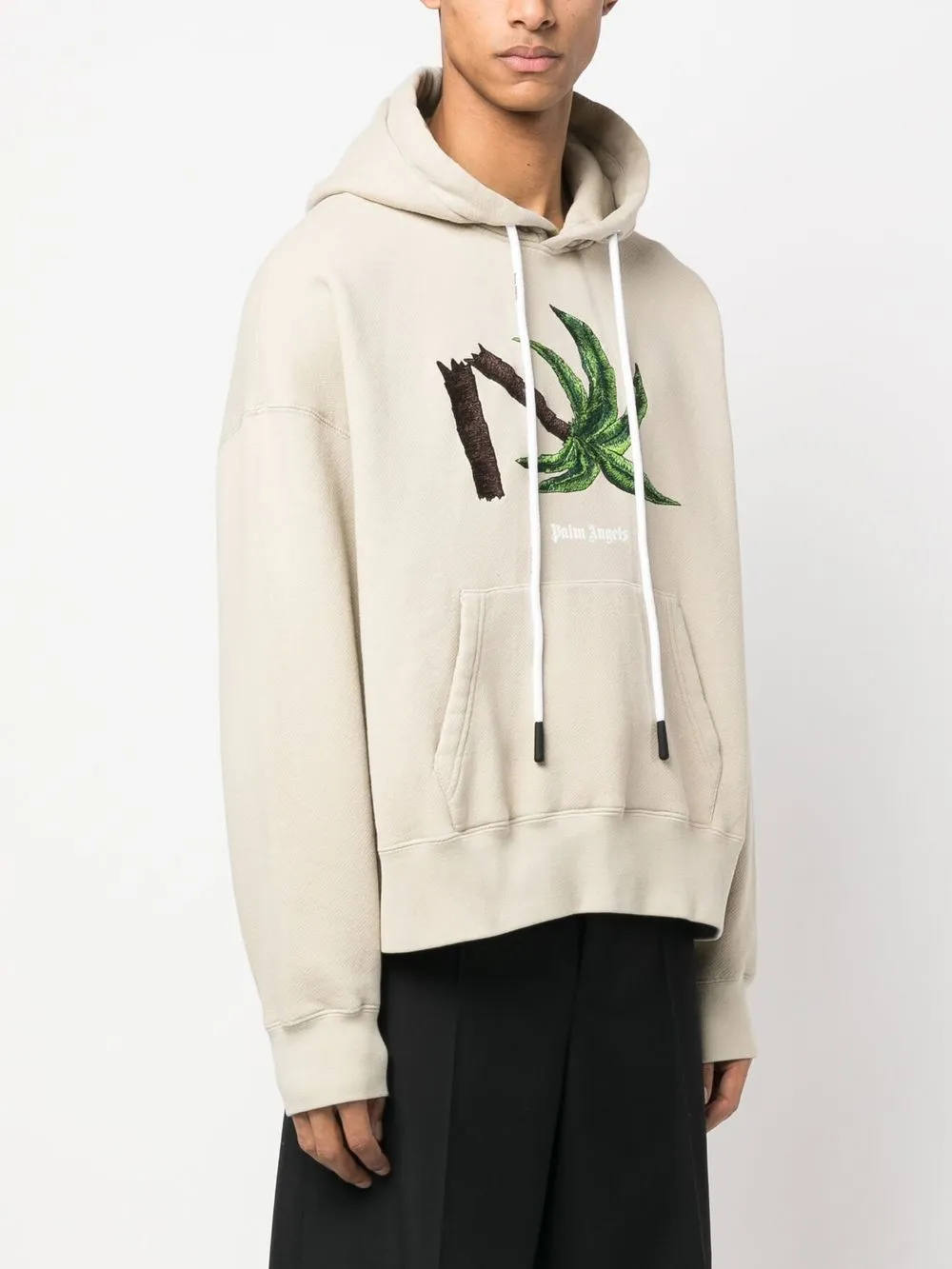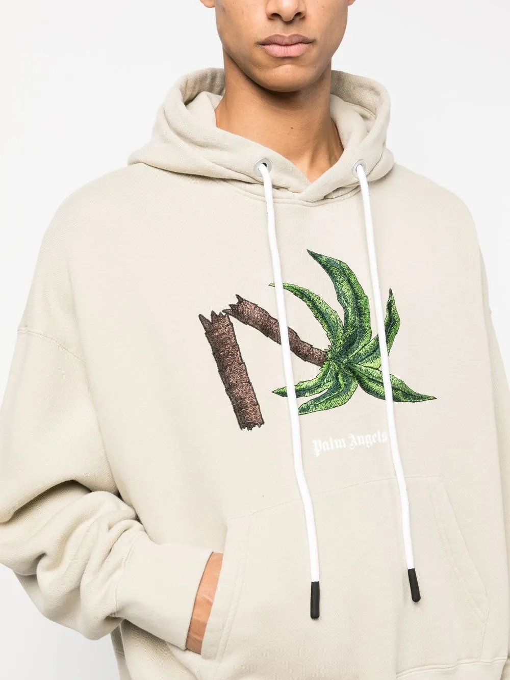 Бежевый, хлопок, принт с изображением пальм, логотип спереди, затягивающийся на шнурок капюшон, длинные рукава и карман-муфта.
