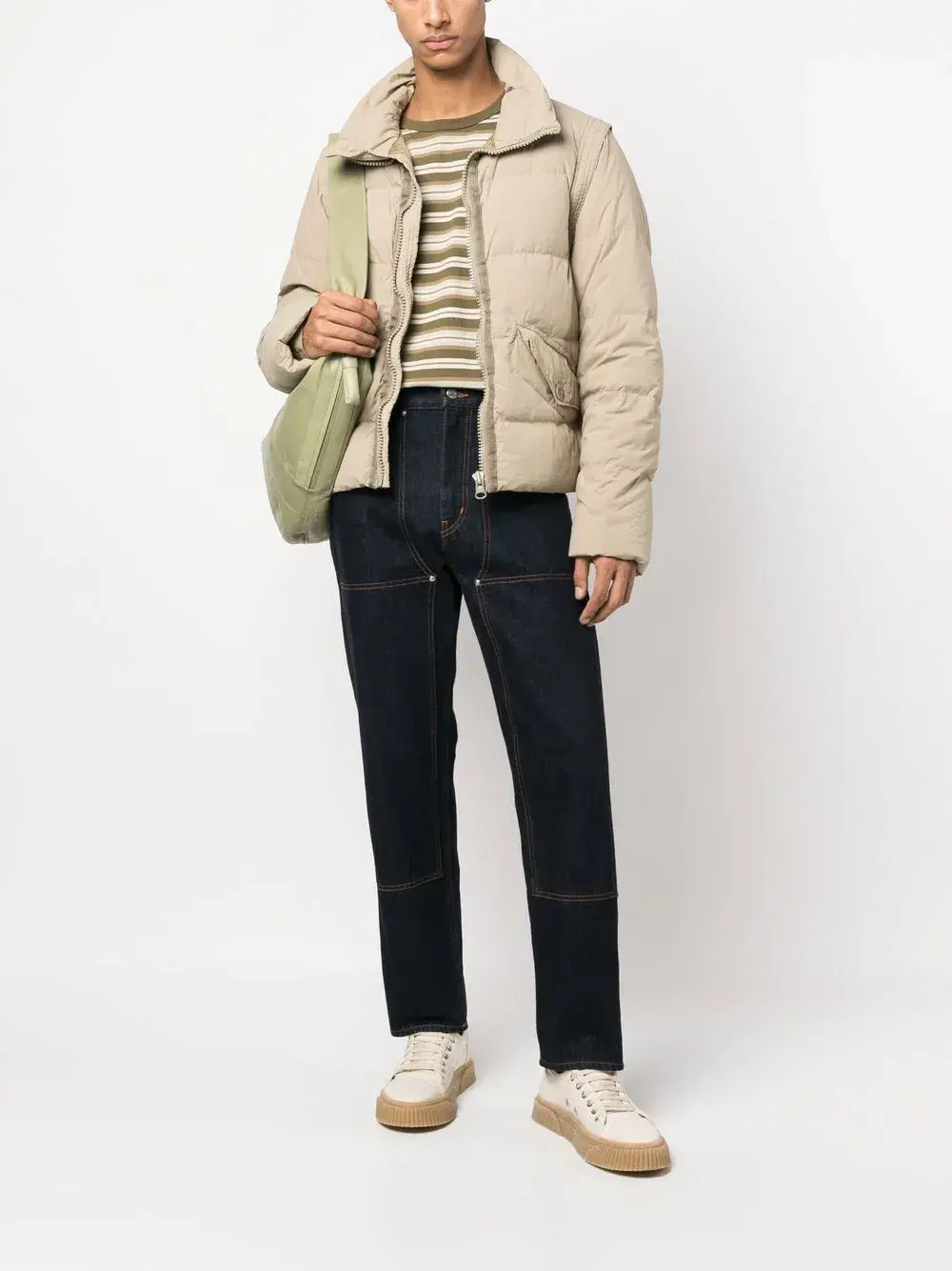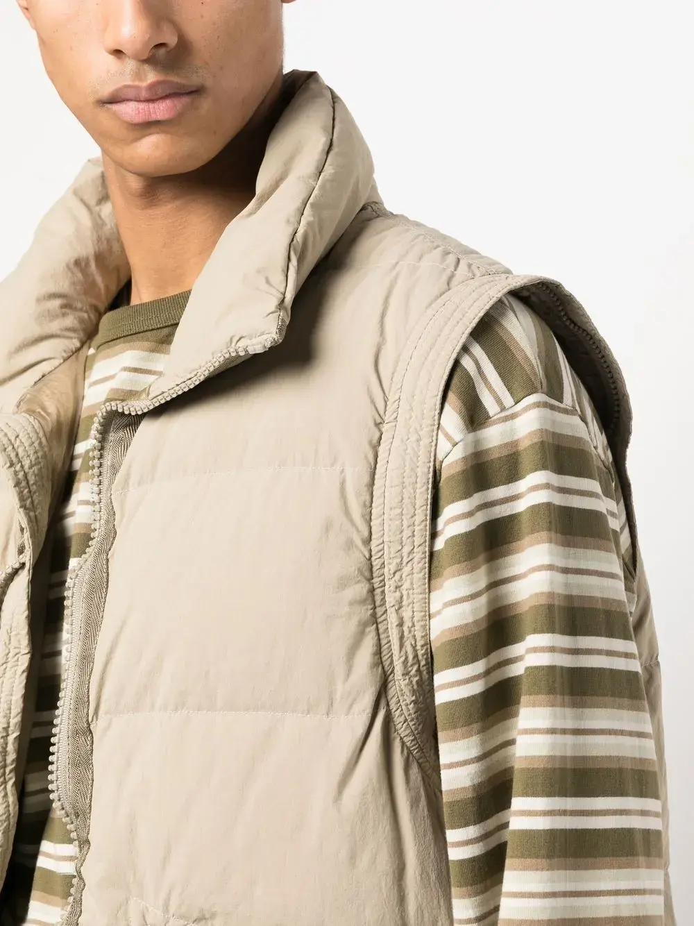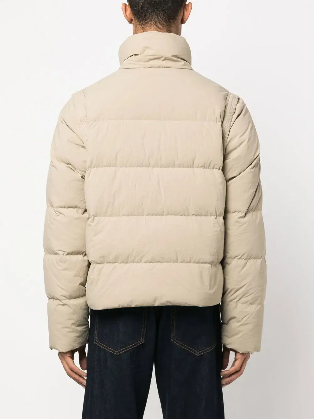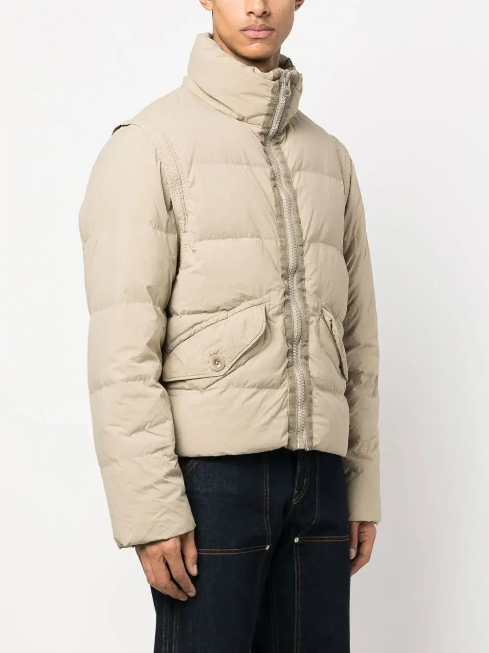 Бежевый, утиный пух, дутый материал, высокий воротник, застежка на молнии спереди, длинные рукава, съемные рукава и передние карманы с клапаном.