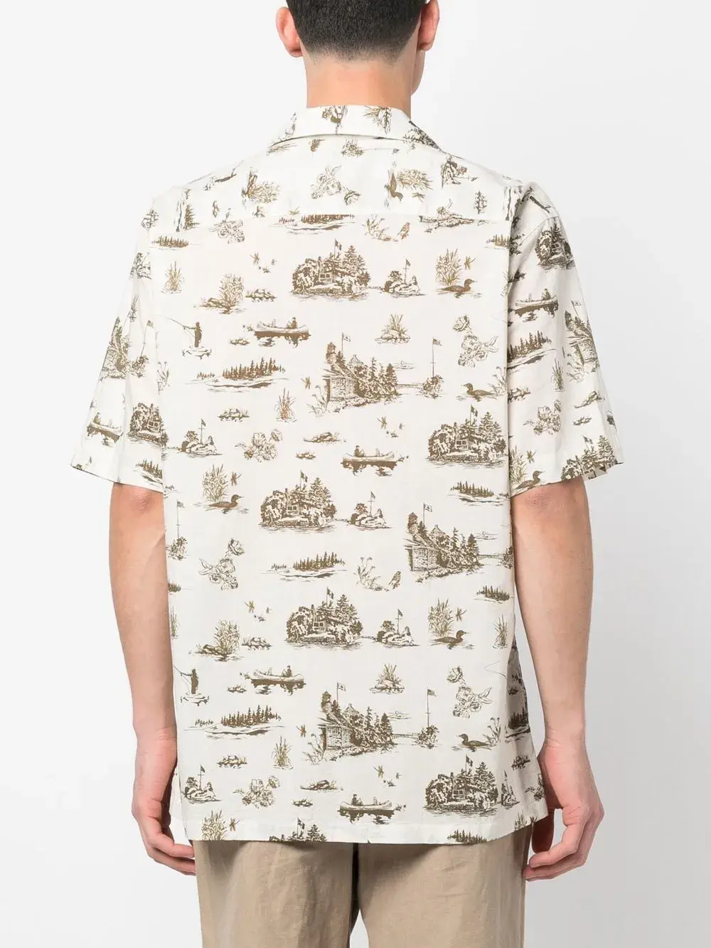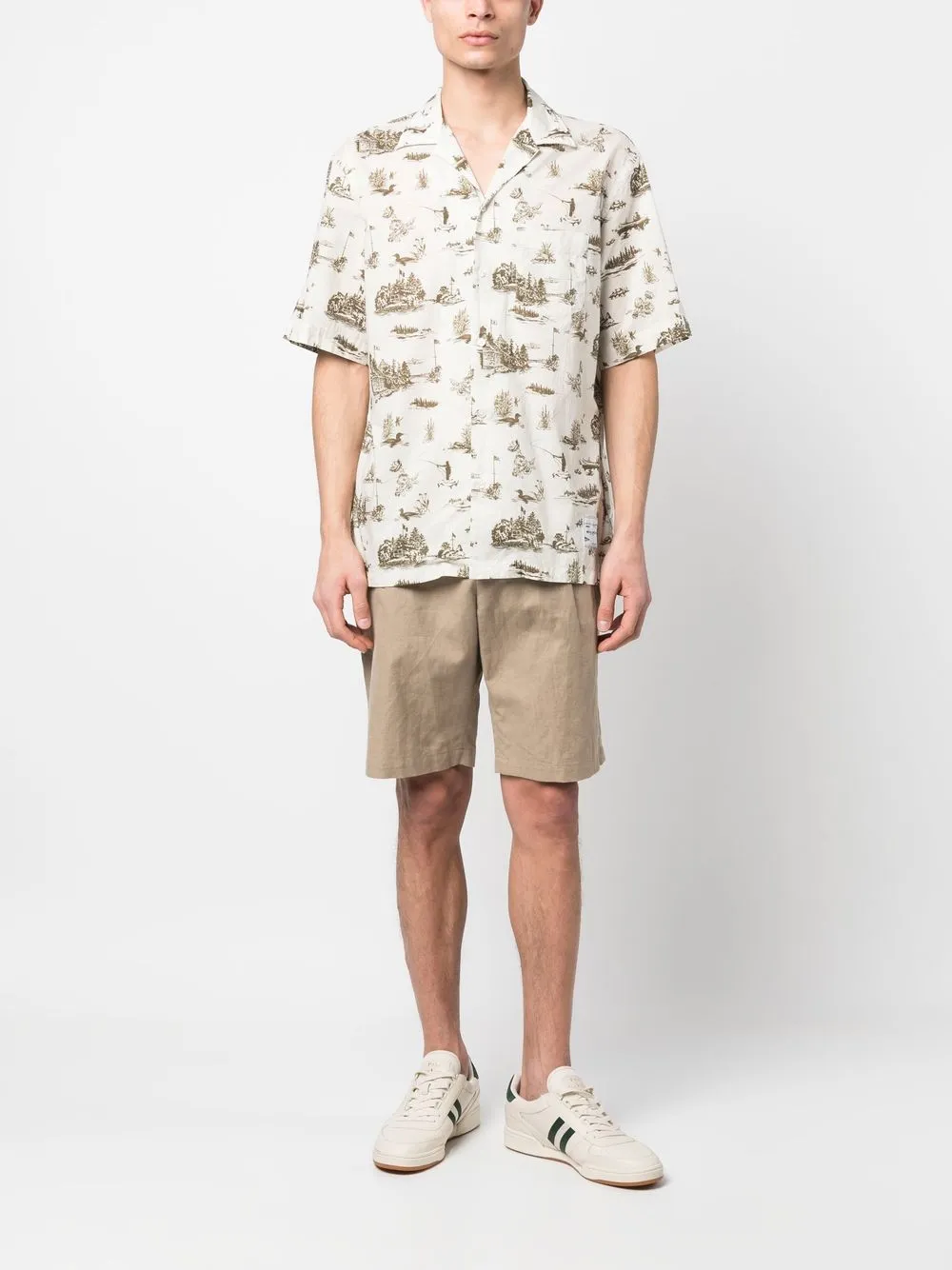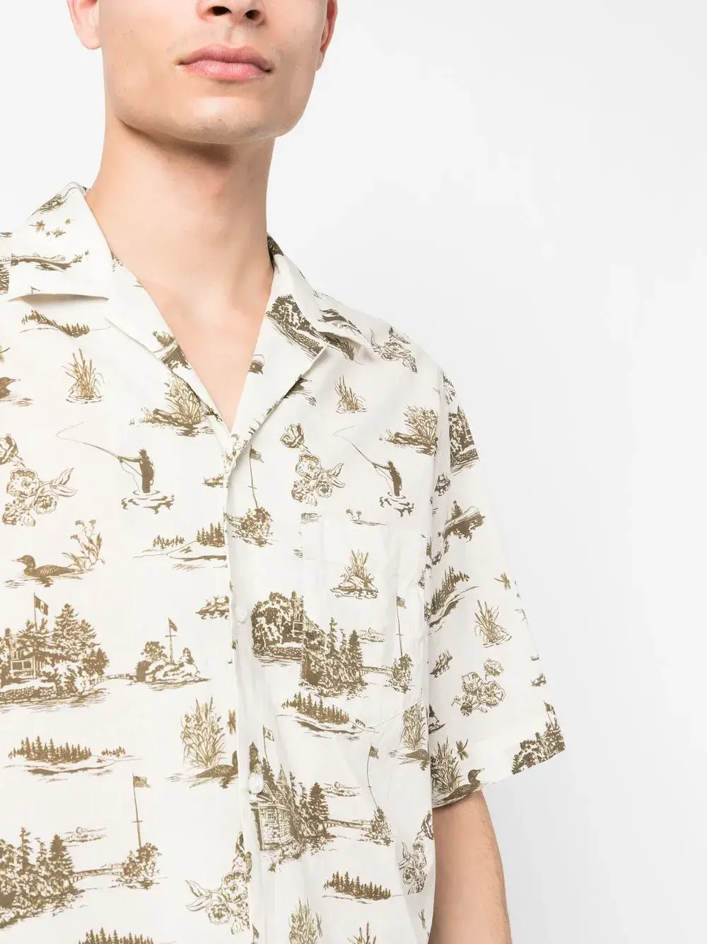 Кремово-белый, хлопок, сплошной графичный принт, отложной воротник, застежка на пуговицах спереди, короткие рукава и нагрудный накладной карман.