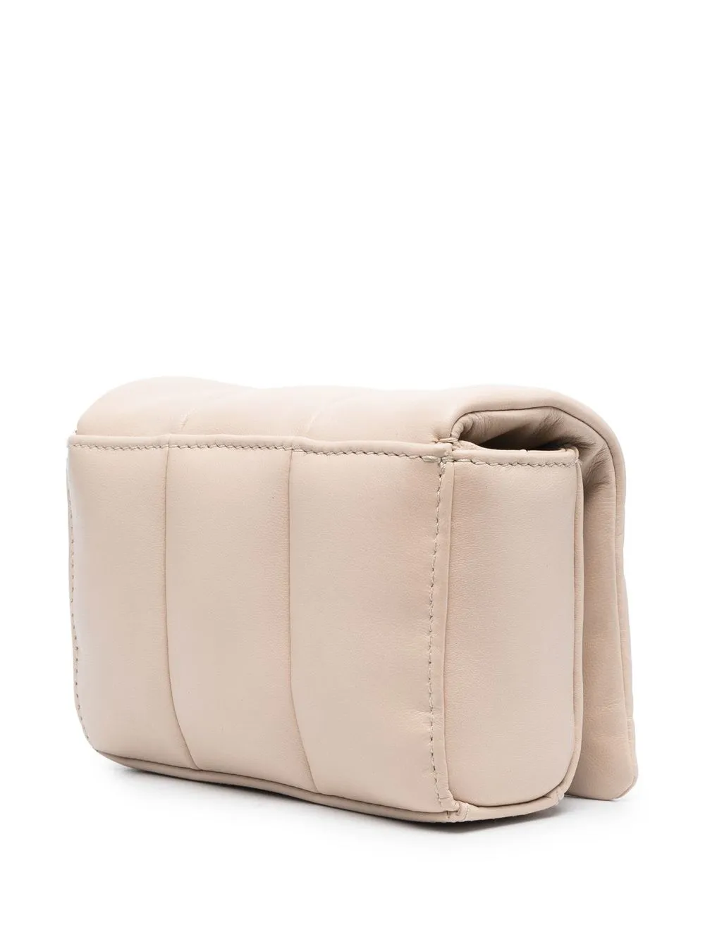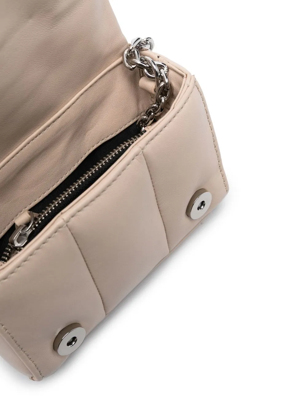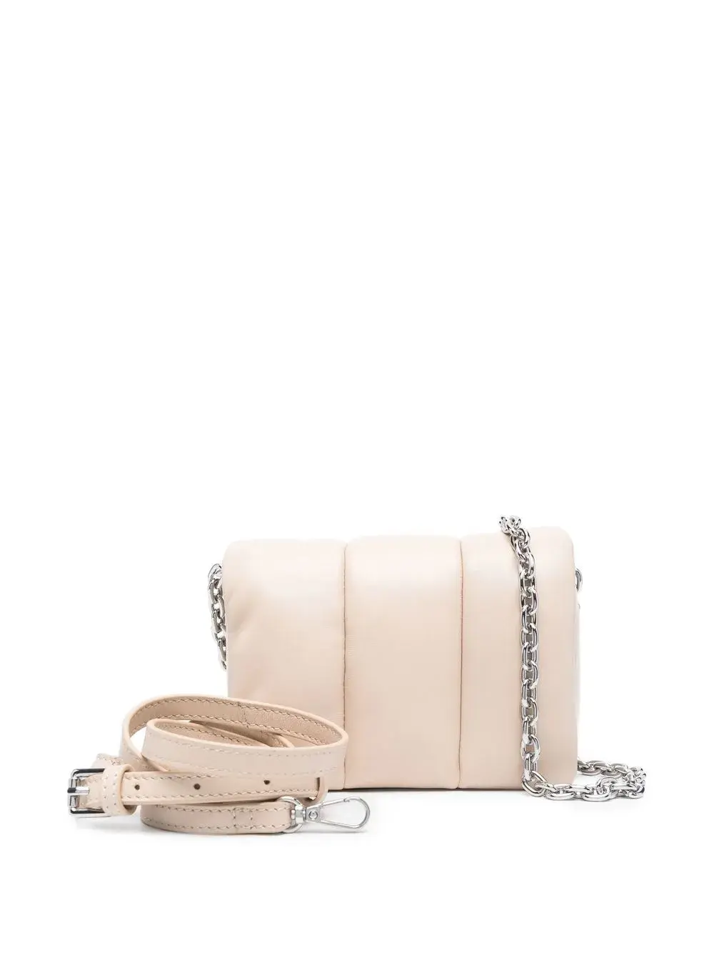 Песочно-коричневый, овечья кожа, дутый материал, откидной клапан на магните, несколько отделений, внутренний карман на молнии, ремешок-цепочка на плечо и съемный регулируемый ремень на талию из кожи и металла.