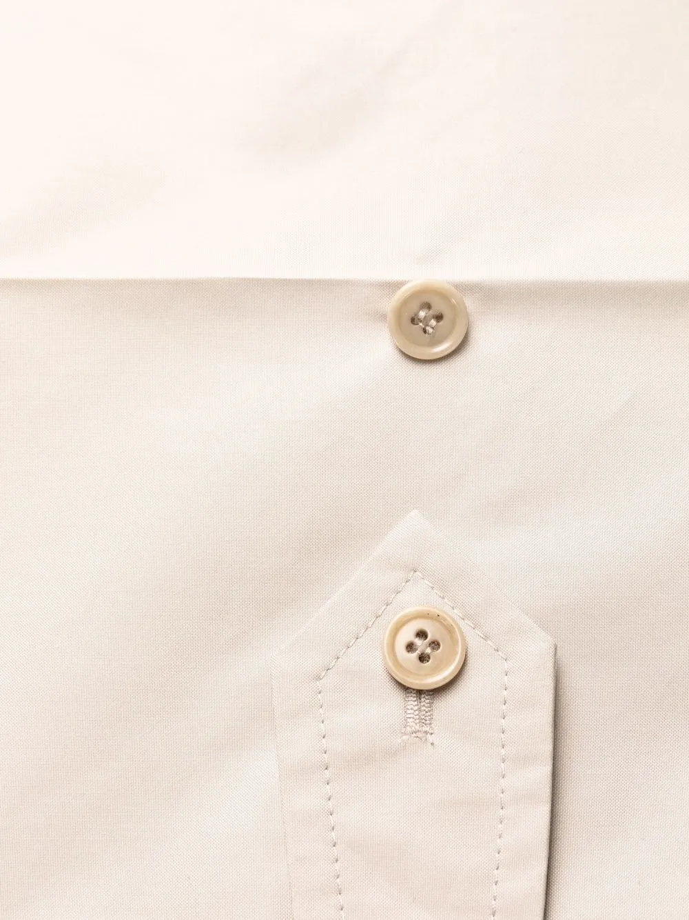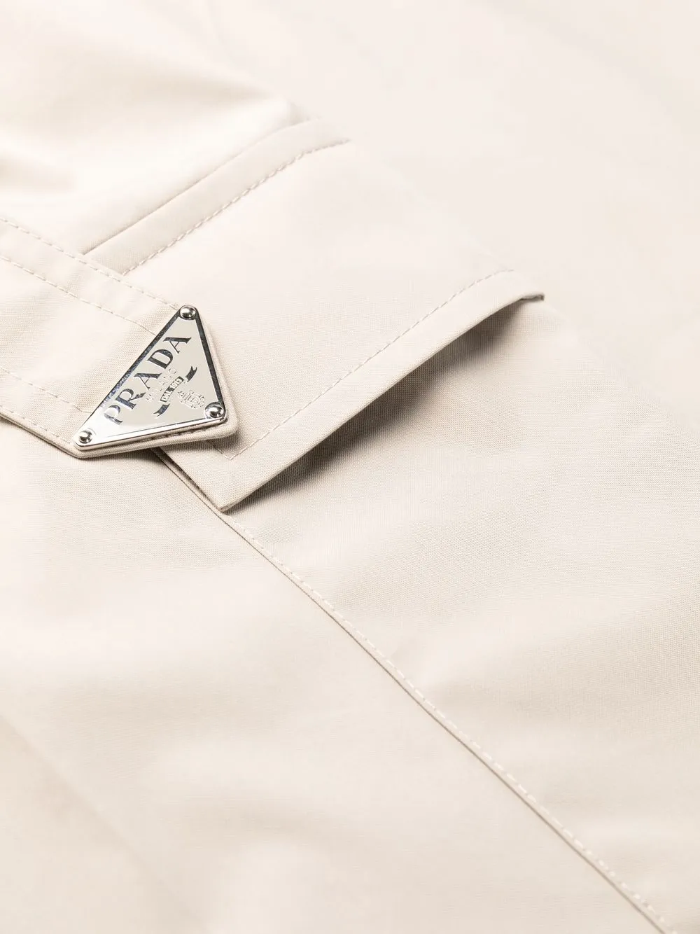 Светло-бежевый, смесовый хлопок, треугольный эмалированный логотип, стрелки, ремень на талии, два кармана на пуговице по бокам, два накладных кармана спереди и два кармана с листочкой сзади.