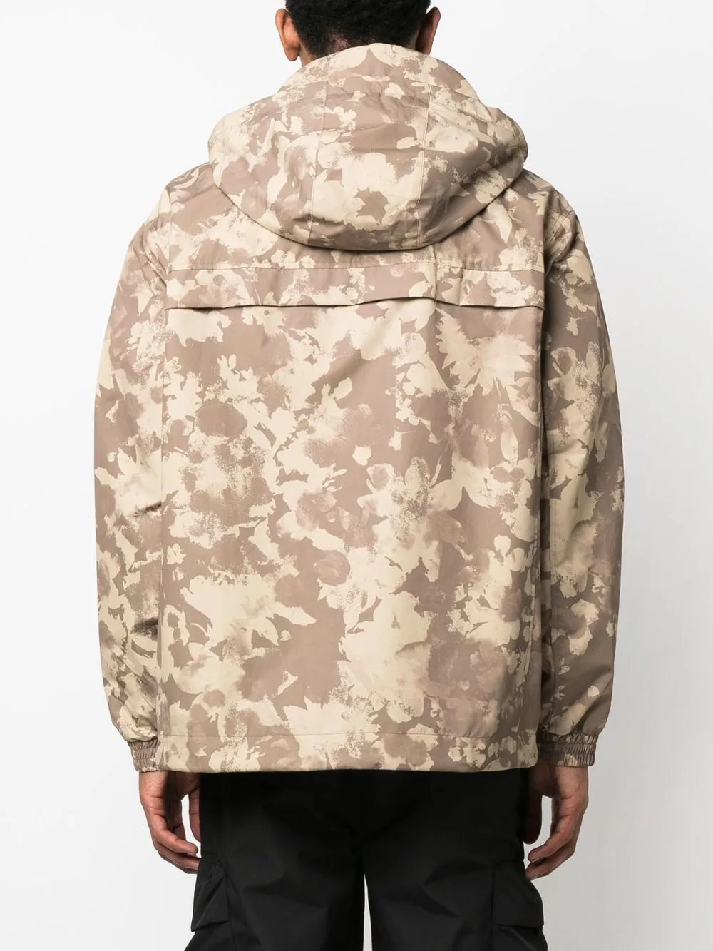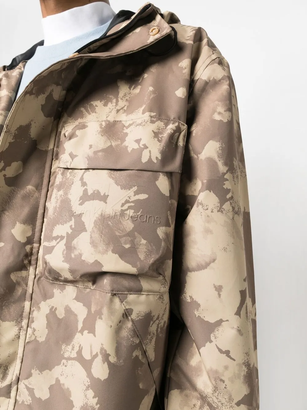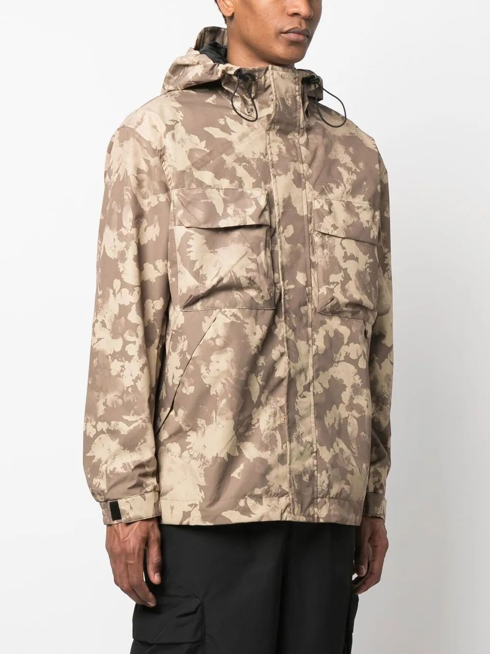 Коричневый, бежевый, абстрактный принт, высокий воротник, затягивающийся на шнурок капюшон, два нагрудных кармана с клапанами, потайная застежка спереди, длинные рукава, манжеты на липучках и прямой подол.