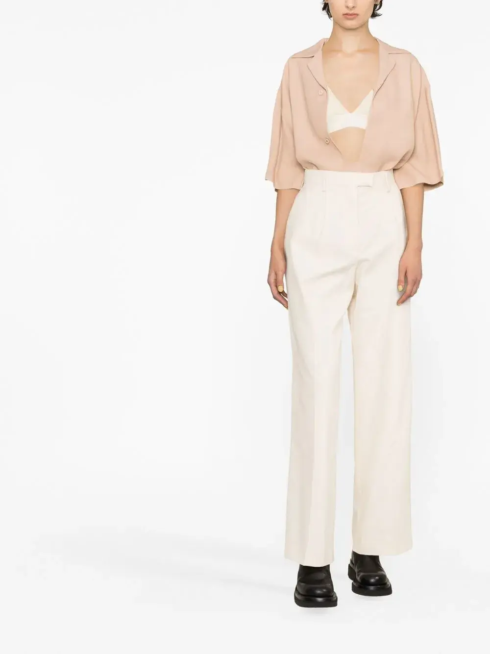 Бежевый, хлопок, переработанный смесовый купро, бирка с логотипом, стрелки, потайная застежка спереди, прямой крой, два прорезных кармана по бокам и два кармана с листочкой сзади.