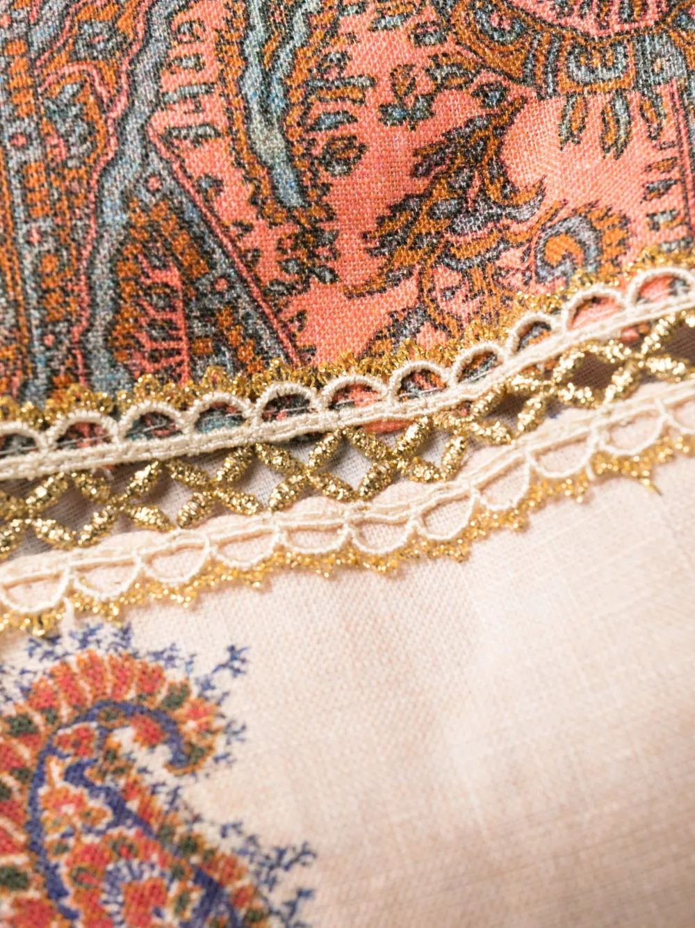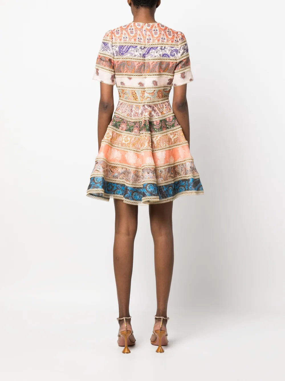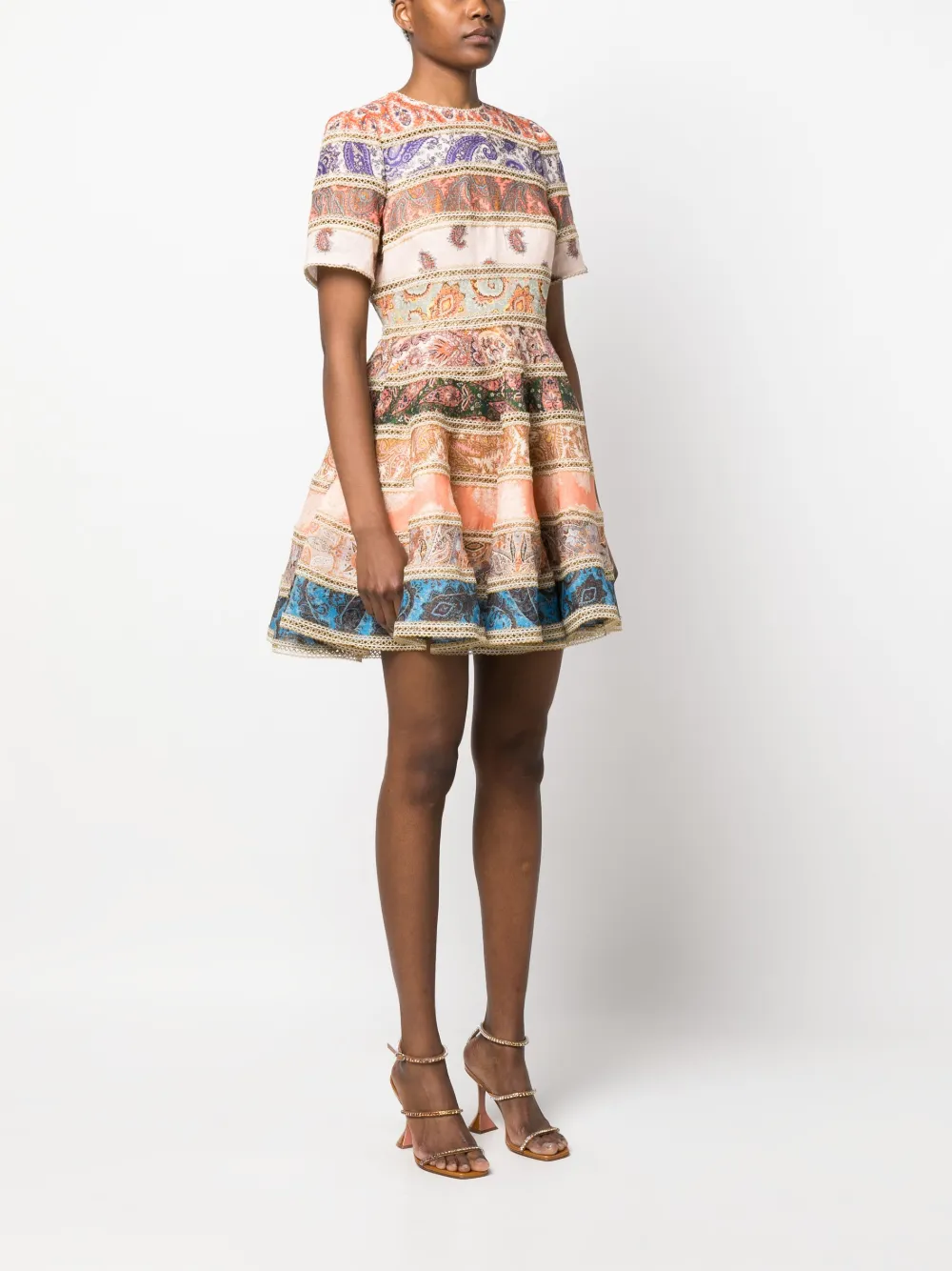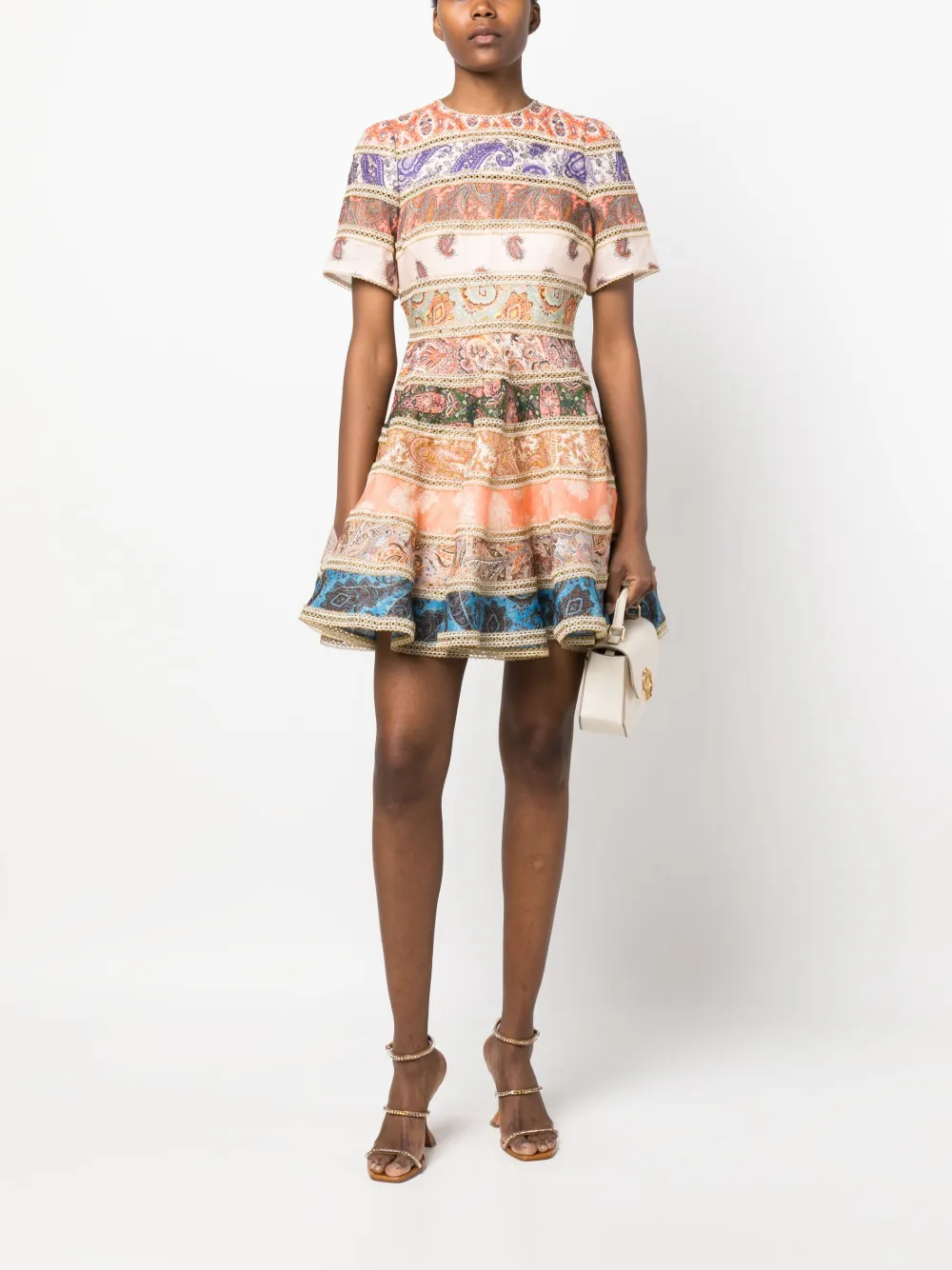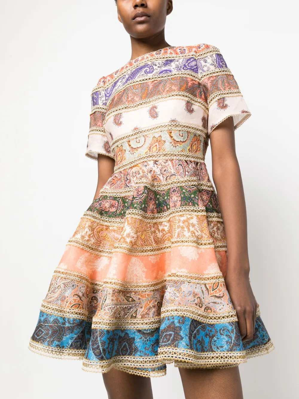 Подробнее о товаре: Разноцветный, лен, сплошной графичный принт, кружевная отделка, потайная застежка на молнии сзади, расклешенная юбка, круглый вырез, короткие рукава и длина до бедер. Этот товар как минимум на 50% состоит из материалов, которые признаны более безопасными для окружающей среды, и/или произведены с использованием методов, которые помогают сократить потребление воды и химических веществ. Узнать больше о том, какие товары получают отметку «Ответственный выбор», можно из материала «Как мы оцениваем экологичность и этичность».