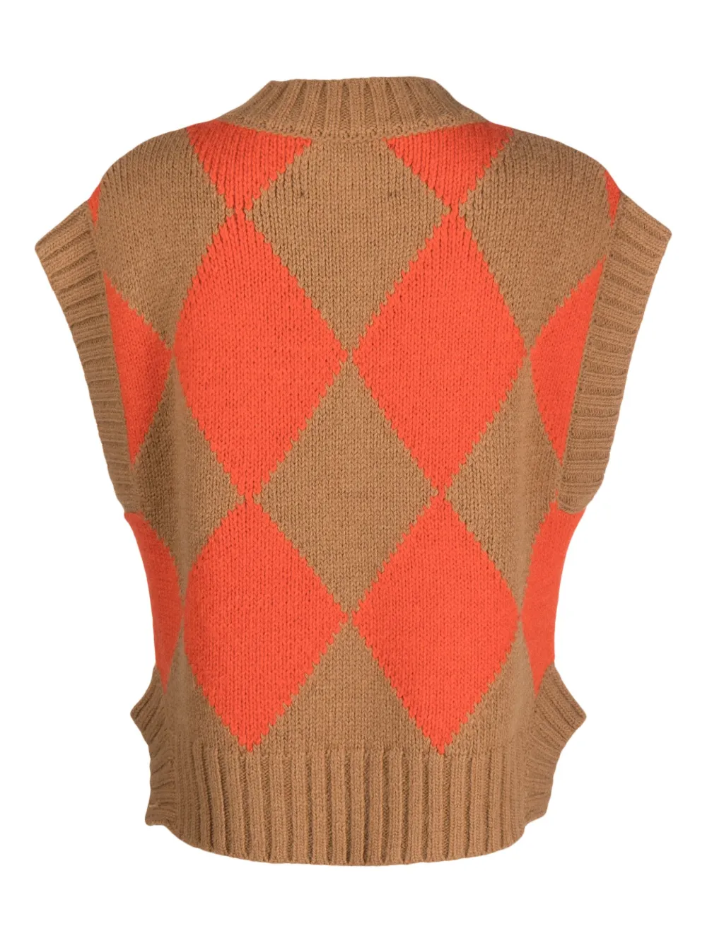 Бежево-коричневый, морковный, смесовая шерсть альпаки, узор аргайл, трикотажный материал, круглый вырез, без рукавов и вязаные края в рубчик.