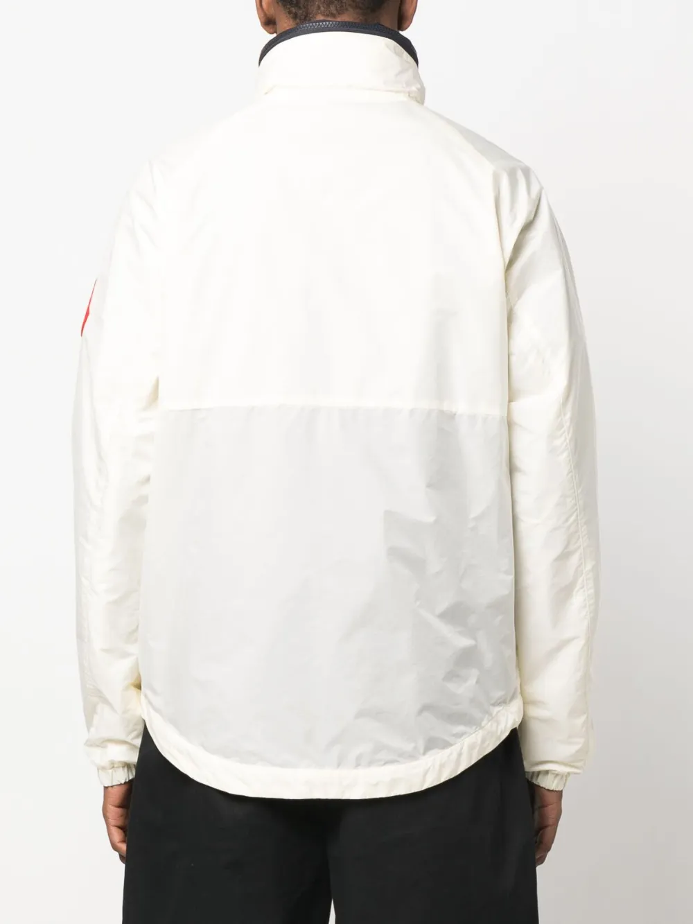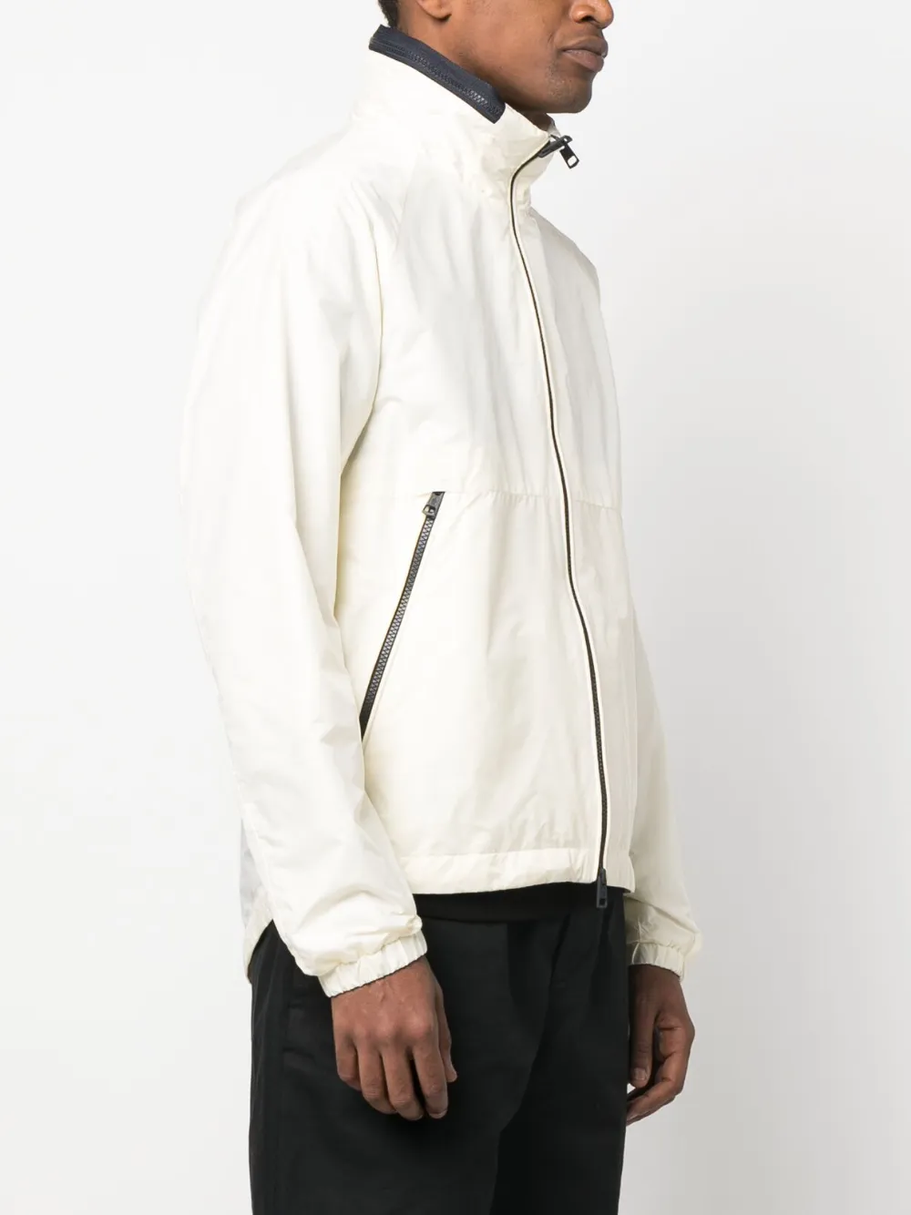 Белый, нашивка с логотипом на рукаве, высокий воротник, потайной капюшон, застежка на молнии спереди, передние карманы на молнии, длинные рукава, эластичные манжеты и прямой подол.