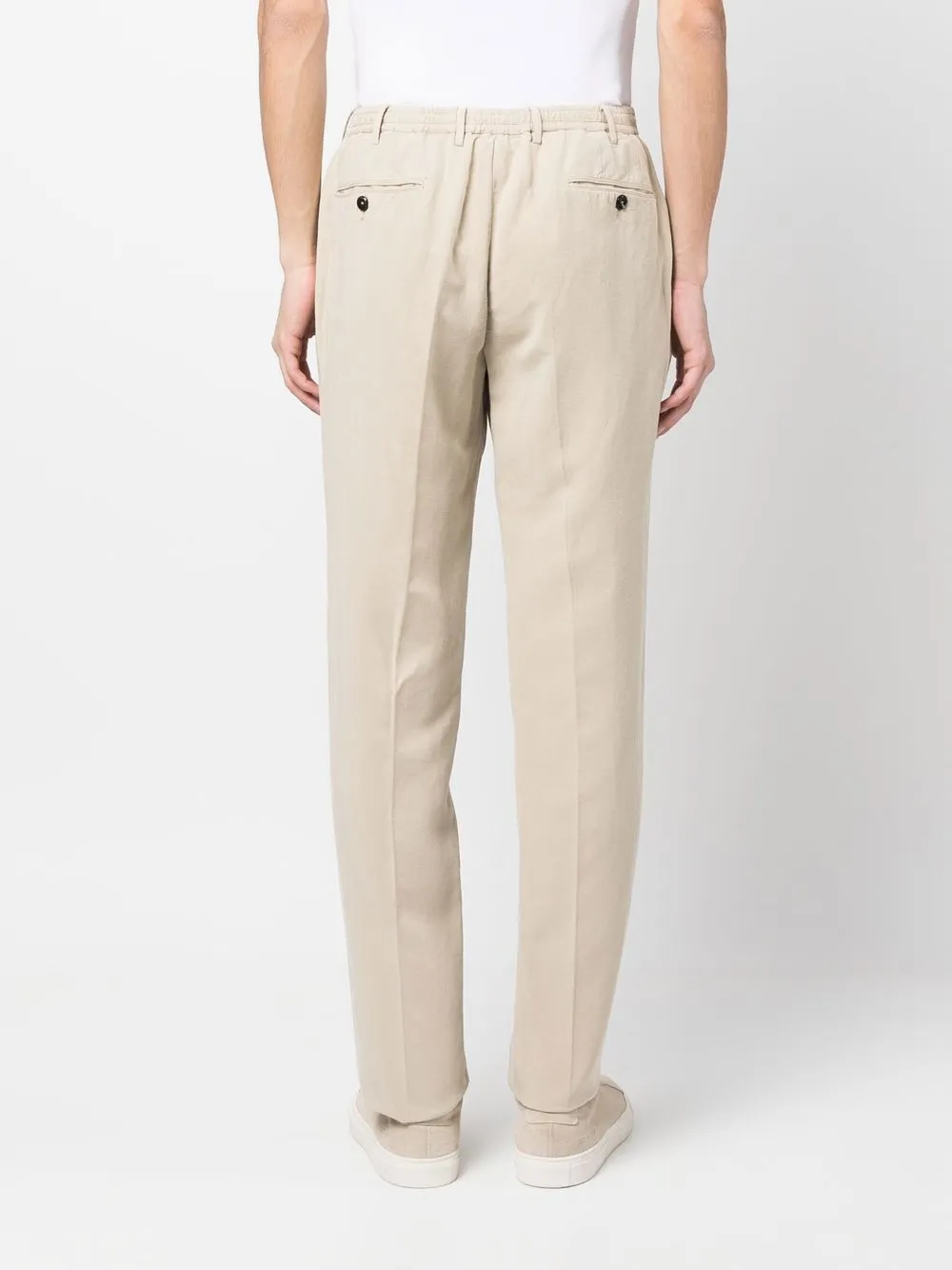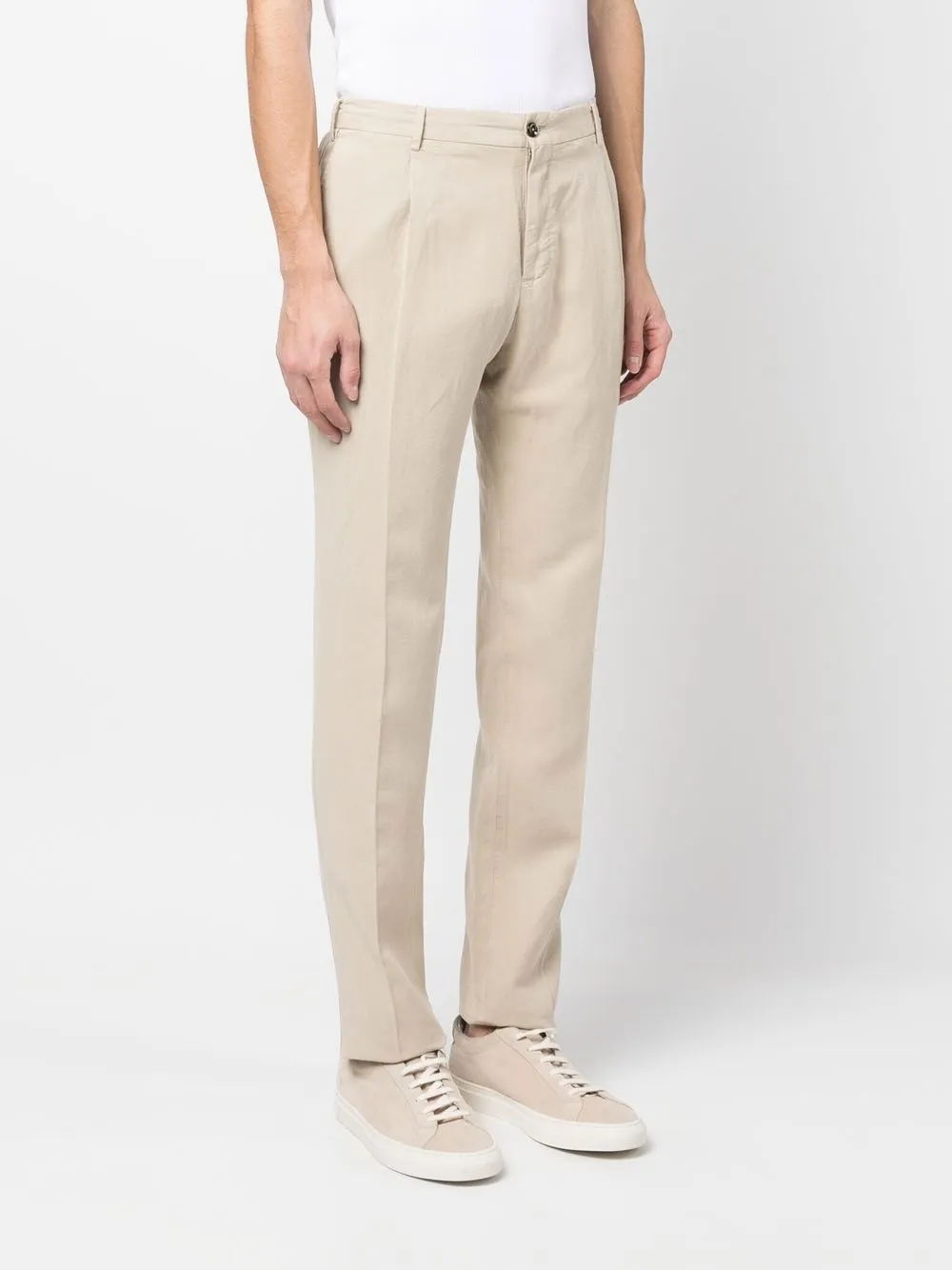 Бежевый, смесь лиоцелла и льна, петли для ремня, эластичный пояс, застежка на молнии и пуговице спереди, узкий крой, два прорезных кармана по бокам и два кармана с листочкой сзади. Ответственный выбор: Этот товар как минимум на 50% состоит из материалов, которые признаны более безопасными для окружающей среды или сертифицированы независимыми организациями.