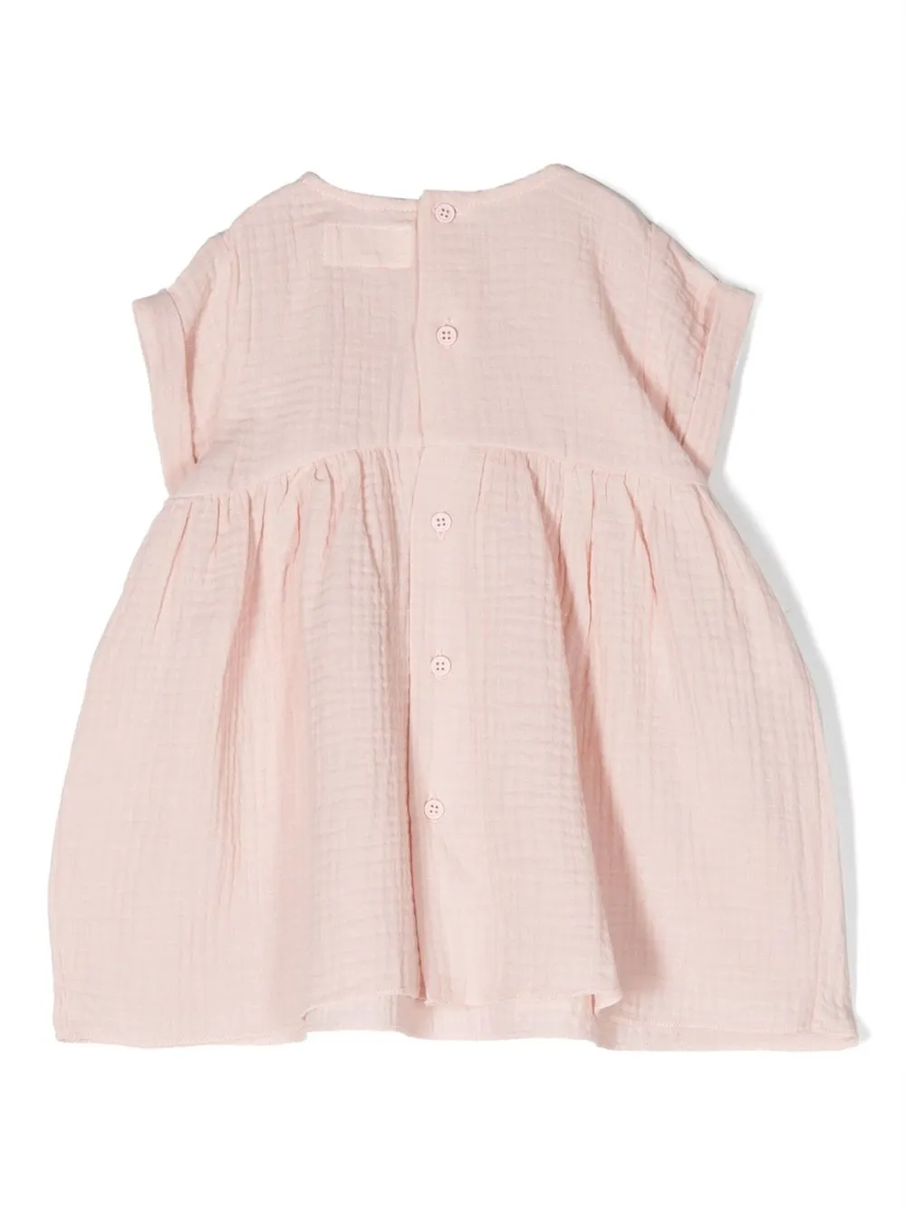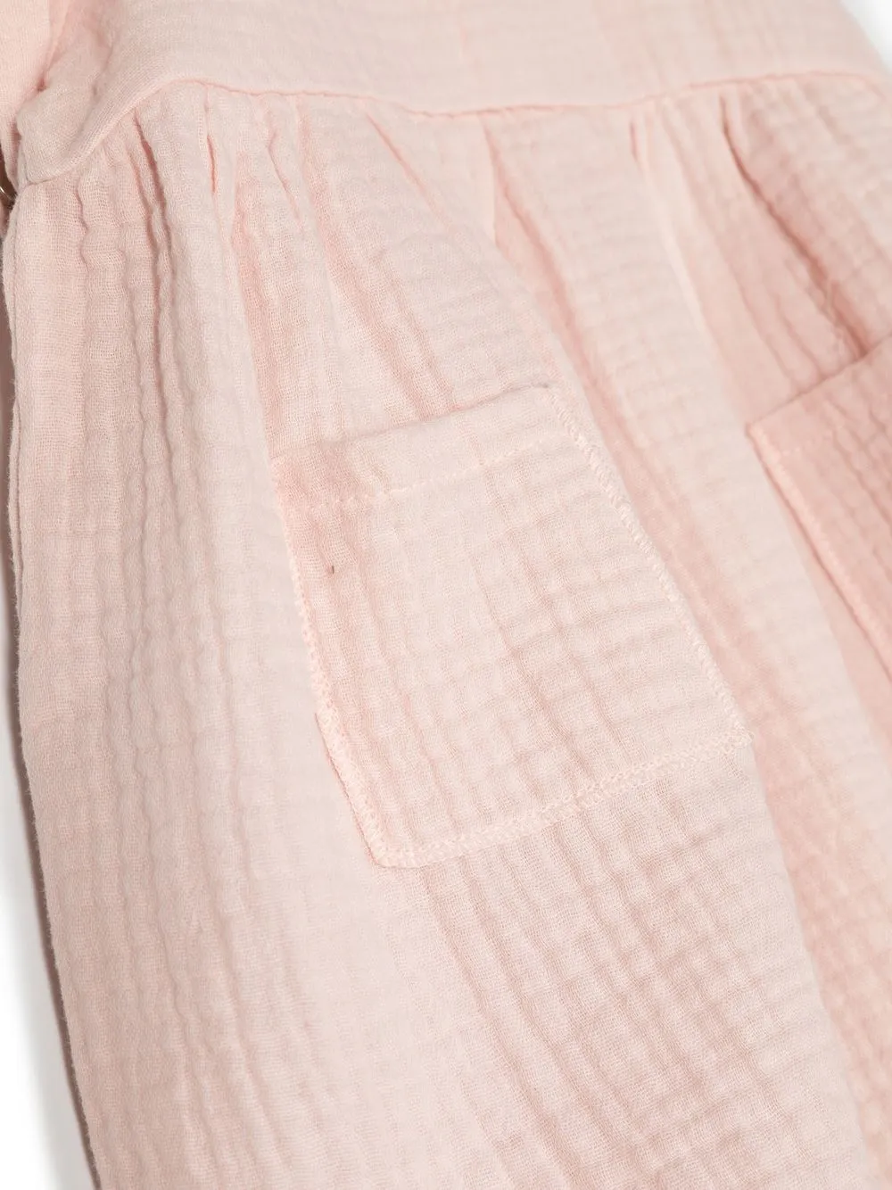 Пудрово-розовый, хлопок, жатый эффект, складки, два накладных кармана спереди, застежка на пуговицы, круглый вырез и короткие рукава.