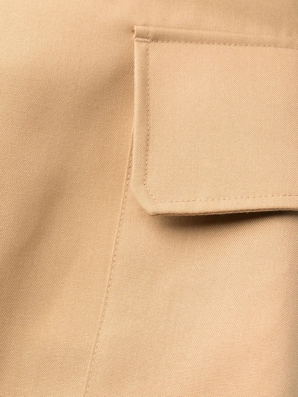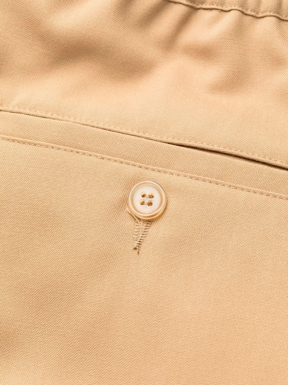 Расцветка Light Brown, необработанная шерсть, смесовый хлопок, эластичный пояс, застежка на молнии и пуговице спереди, два накладных кармана по бокам, задние карманы с листочкой, карман с клапаном сзади и прямой крой.