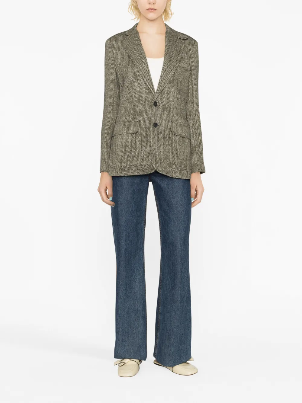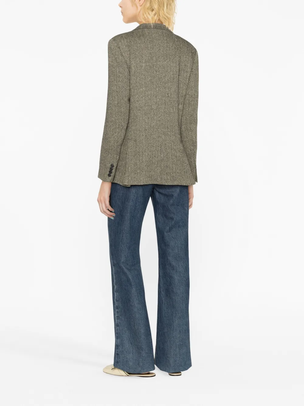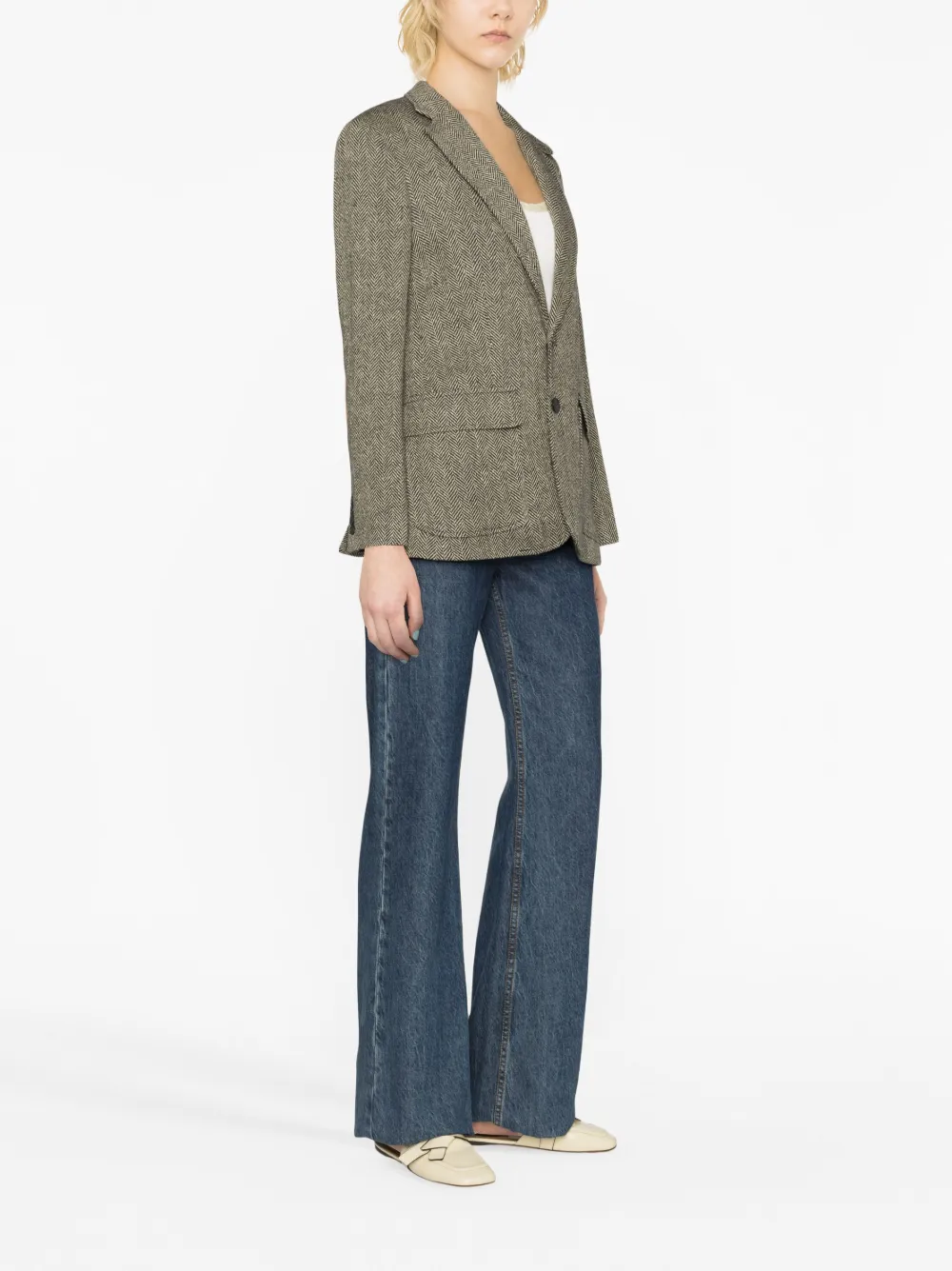 Песочно-бежевый, смесь льна и шелка, классический крой, застежка на пуговицах спереди, зазубренные лацканы, прорезной карман на груди, два кармана с клапанами по бокам, манжеты на пуговицах и принт в елочку.