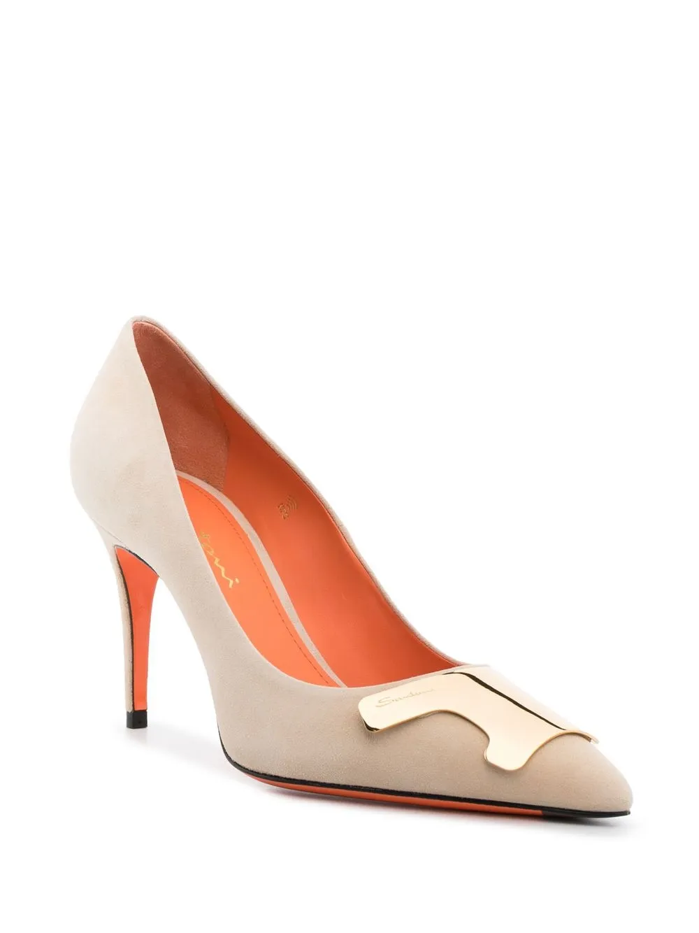 Бежевый, замша из телячьей кожи, золотистый металлический логотип, стелька с логотипом, модель без застежки, заостренный носок и каблук-шпилька.