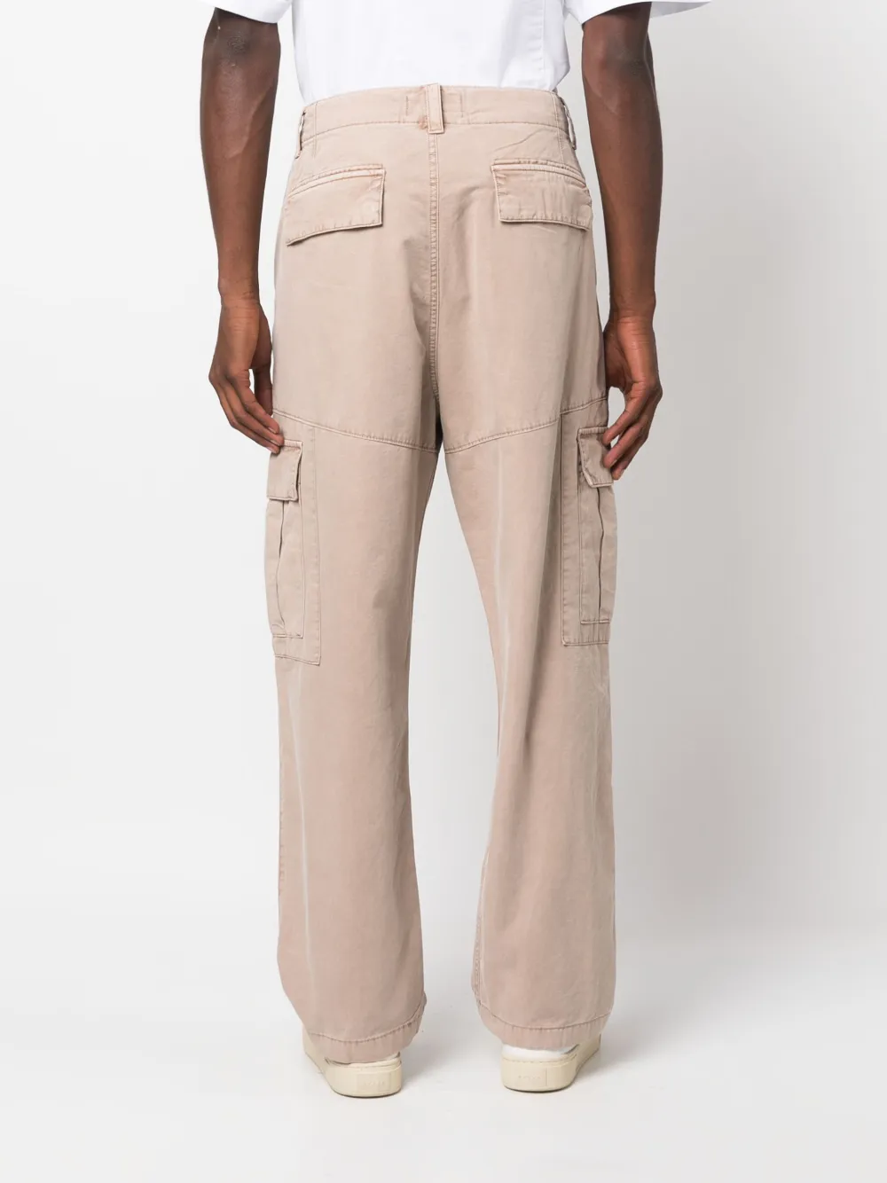 Светло-бежевый, хлопок, нашивка с логотипом сбоку, строчка в тон, прямой крой, потайная застежка на молнии и пуговицах, петли для ремня, два прорезных кармана по бокам, два накладных кармана по бокам и два кармана с клапанами сзади.