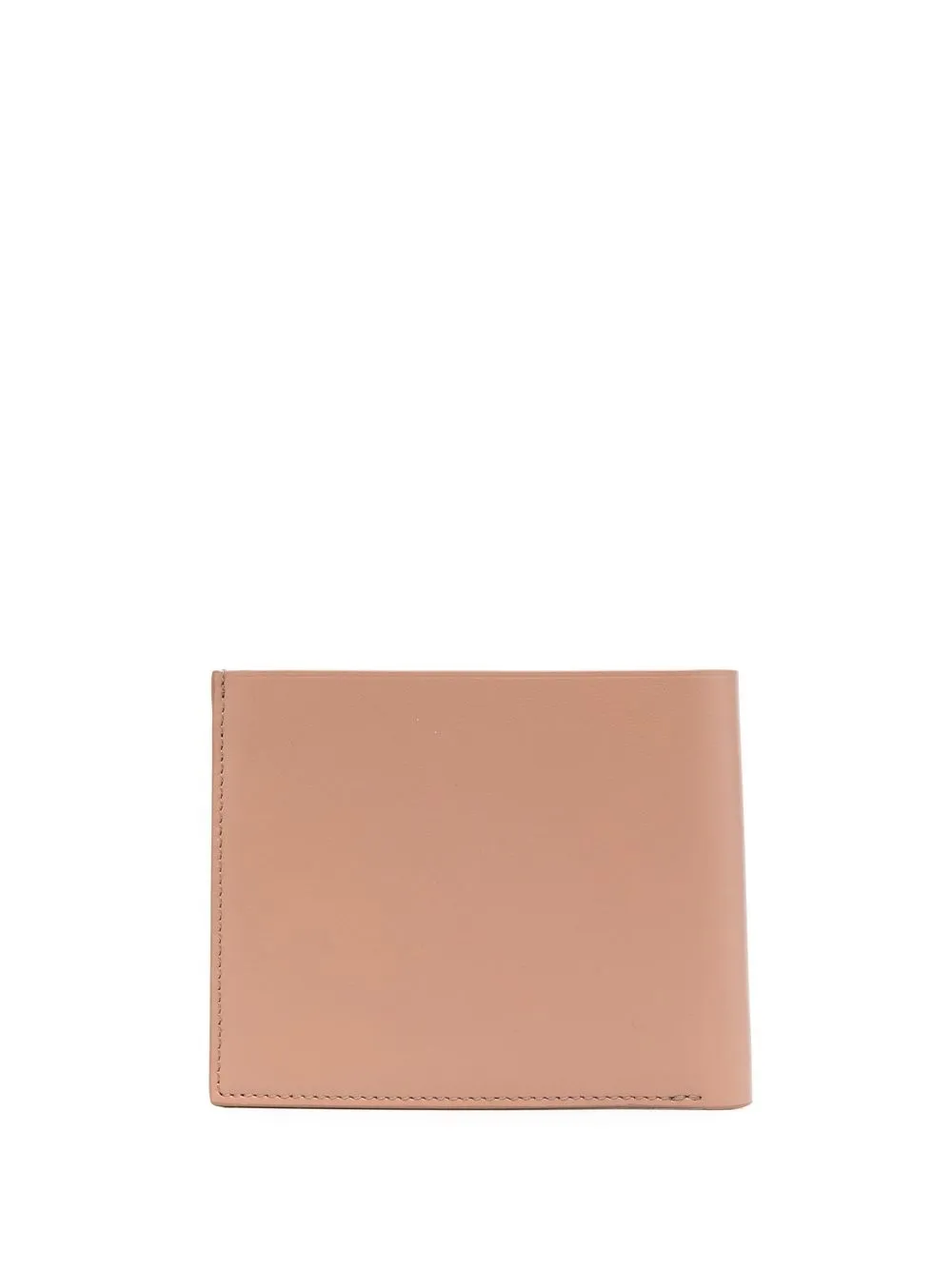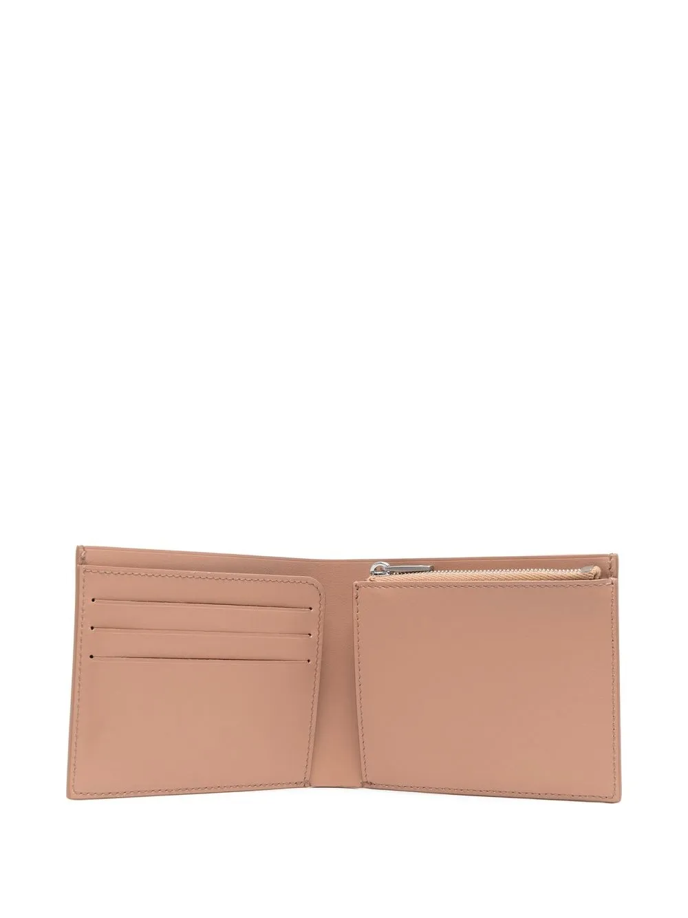 Персиково-розовый, телячья кожа, два сложения, тисненый логотип спереди, карман на молнии и внутреннее отделение для карт.