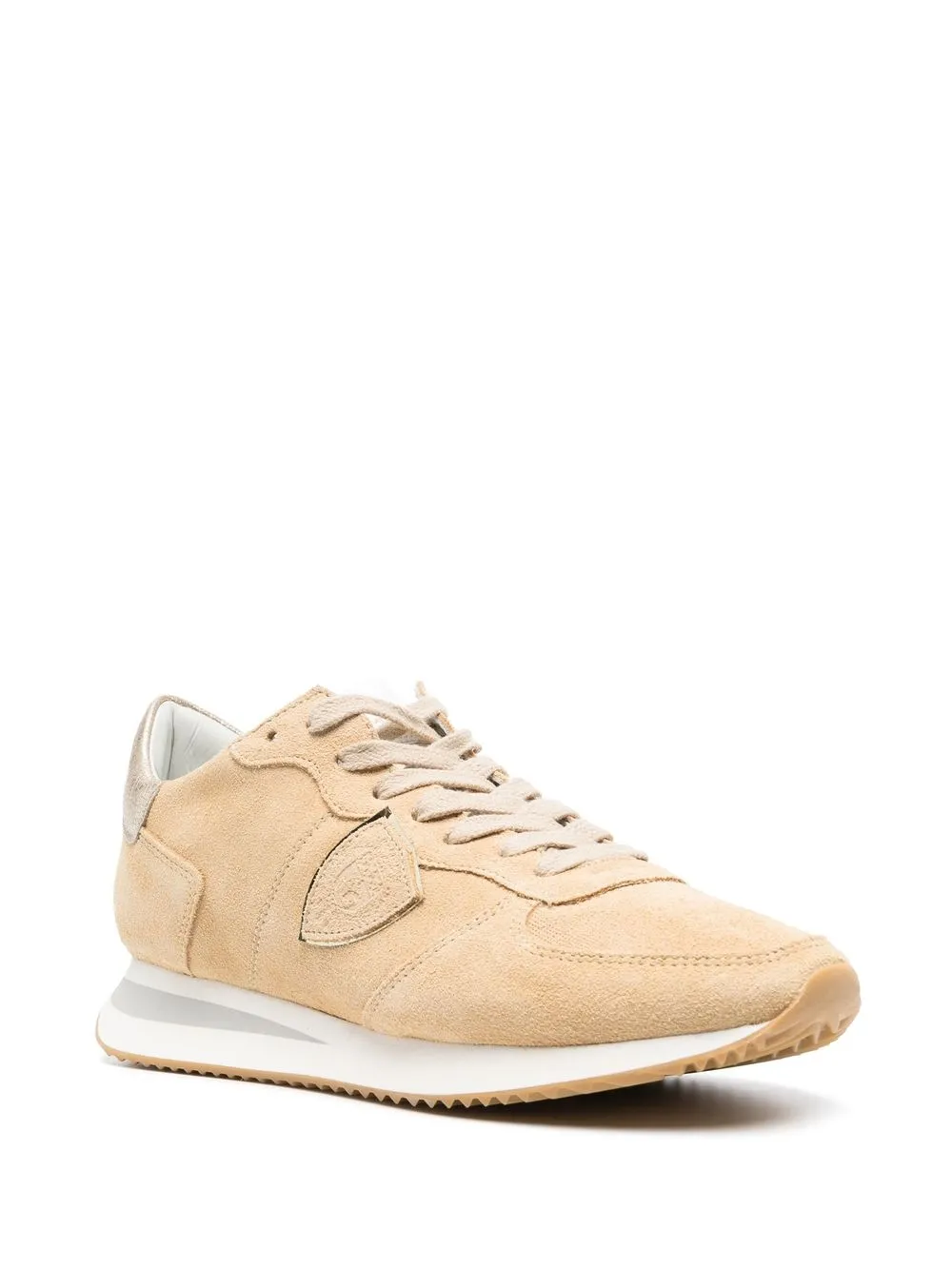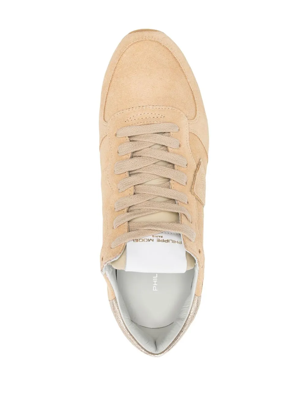 Бежевый, телячья кожа, замша из телячьей кожи, нашивка с логотипом на язычке, нашивка с логотипом сбоку, задник с логотипом, миндалевидный носок и шнуровка спереди.