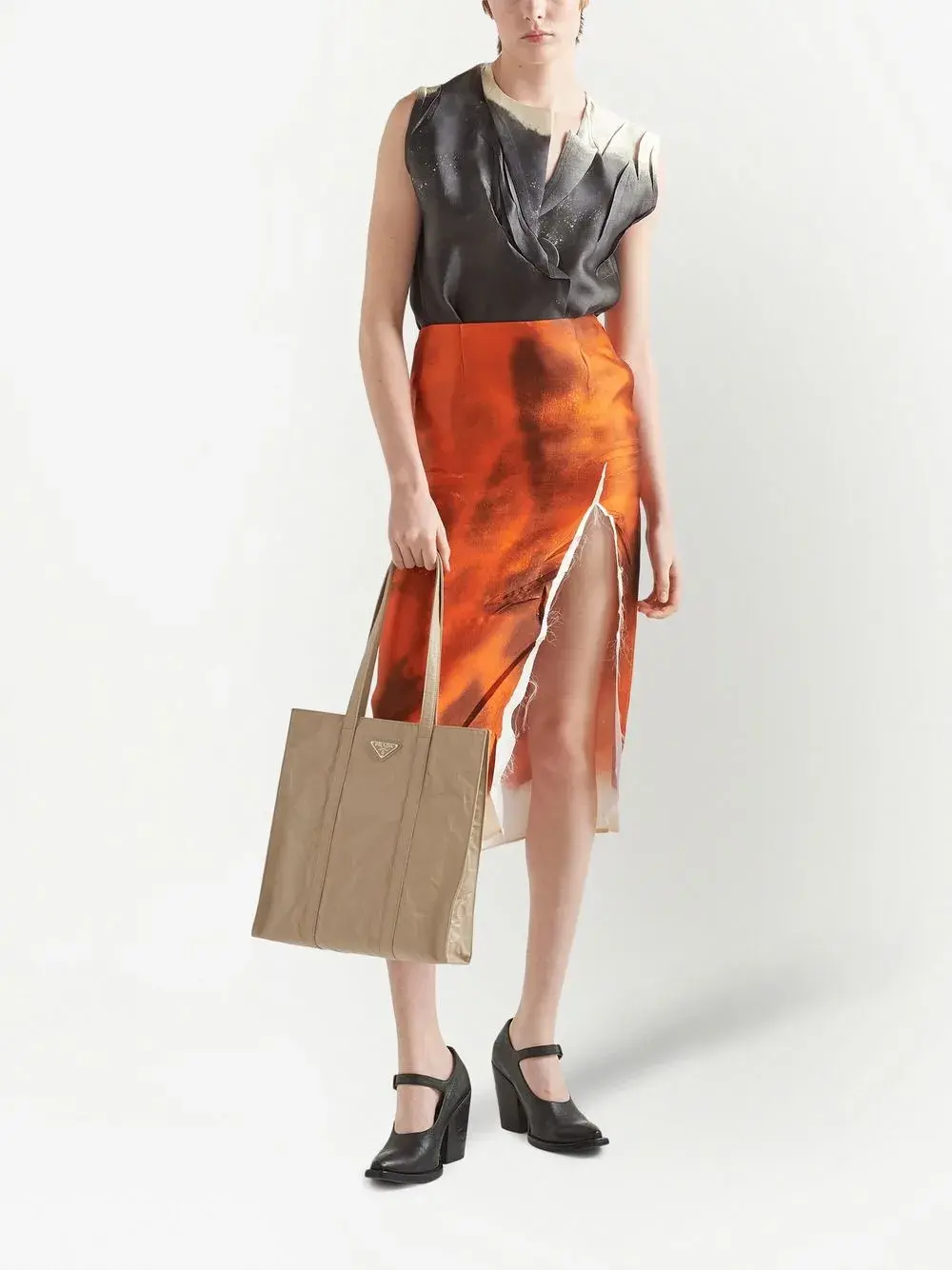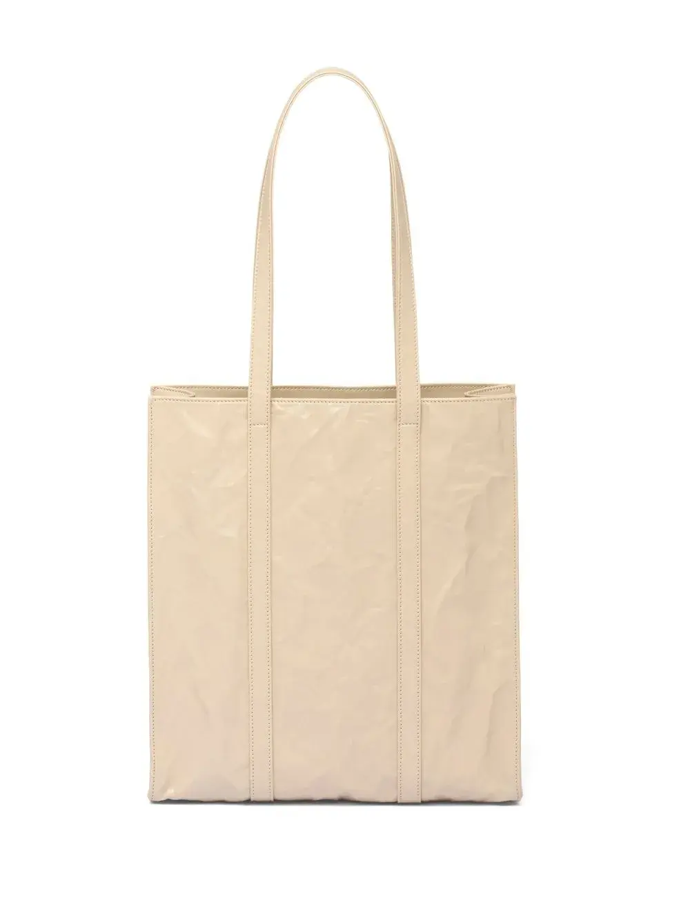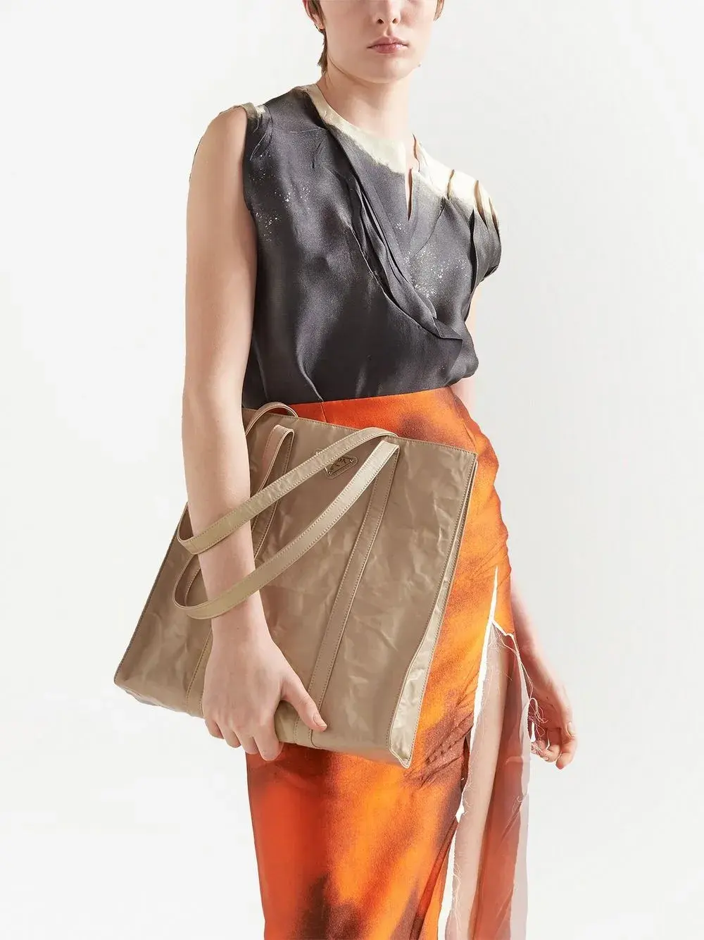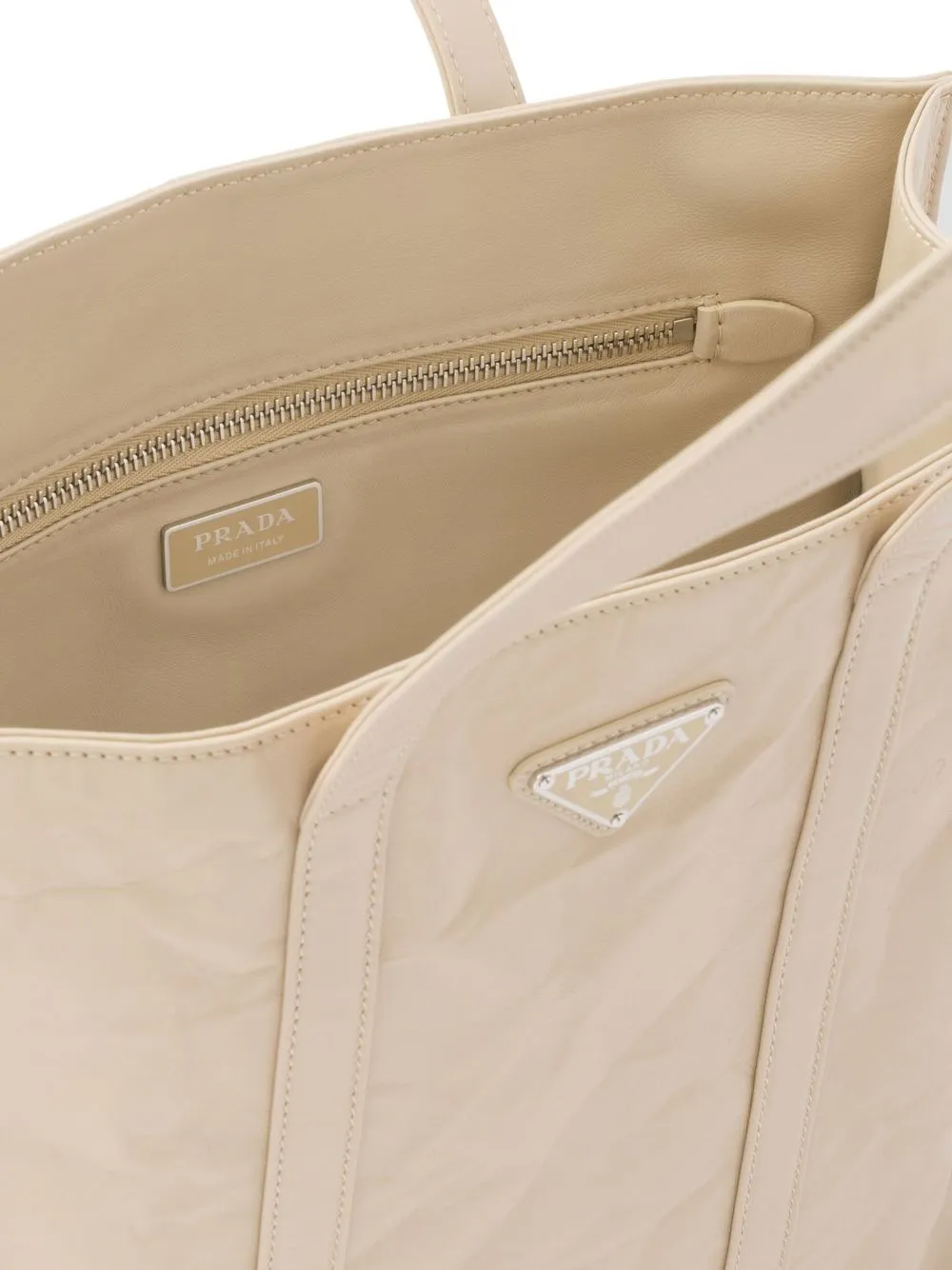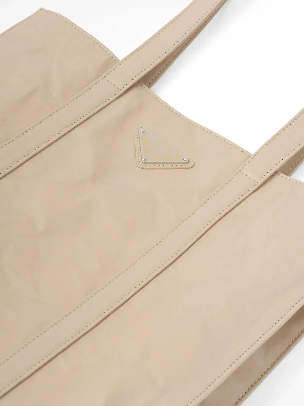 Песочно-бежевый, кожа наппа, треугольный эмалированный логотип, металлический логотип внутри, две верхние ручки, основное отделение и внутренний карман на молнии.