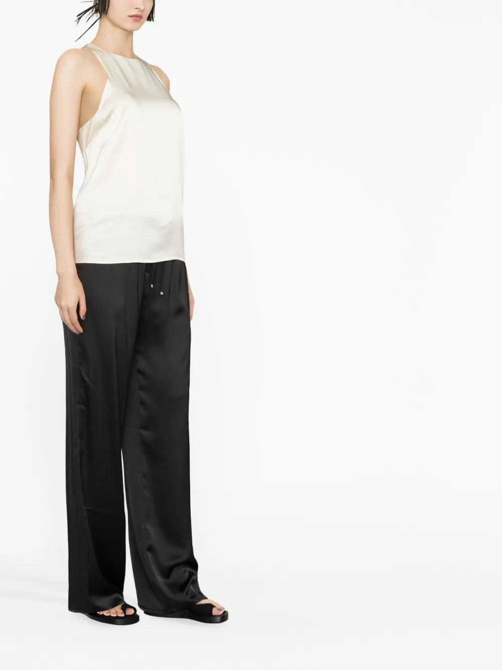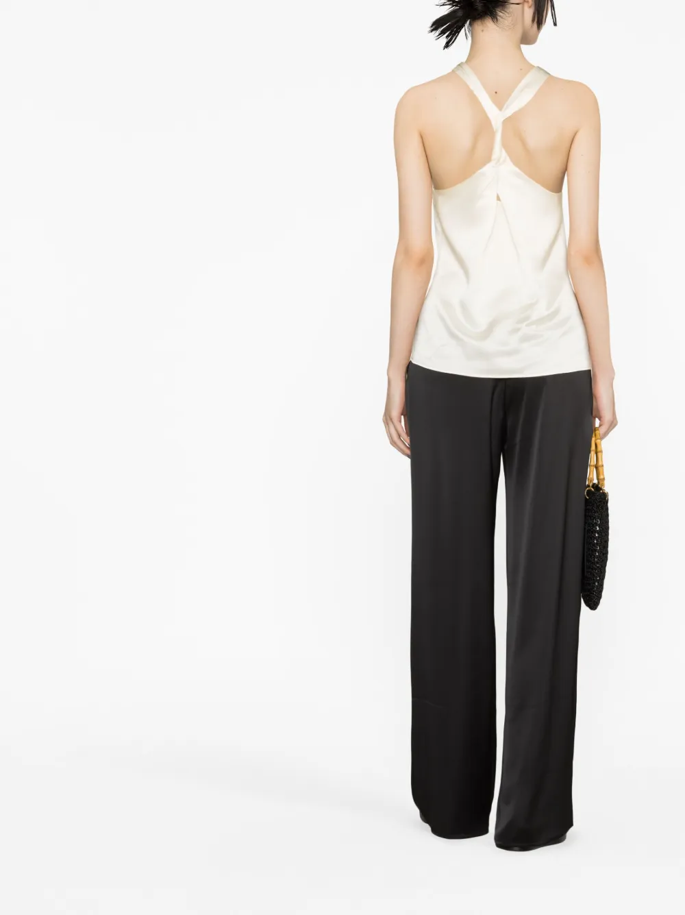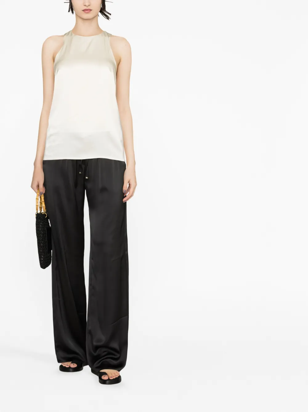 Цвет слоновой кости, шелк, сатиновая фактура, перекрученная деталь, круглый вырез, вырез рейсер, без рукавов и прямой подол.