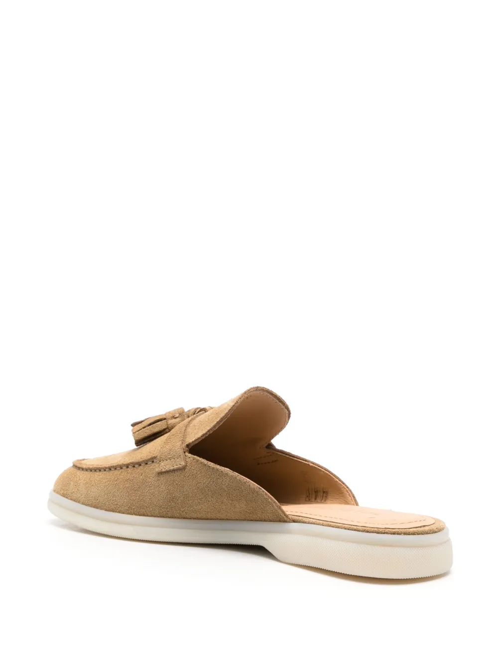 Бежево-коричневый, замша из телячьей кожи, декоративные кисточки, миндалевидный носок, кожаная стелька с логотипом и плоская резиновая подошва.
