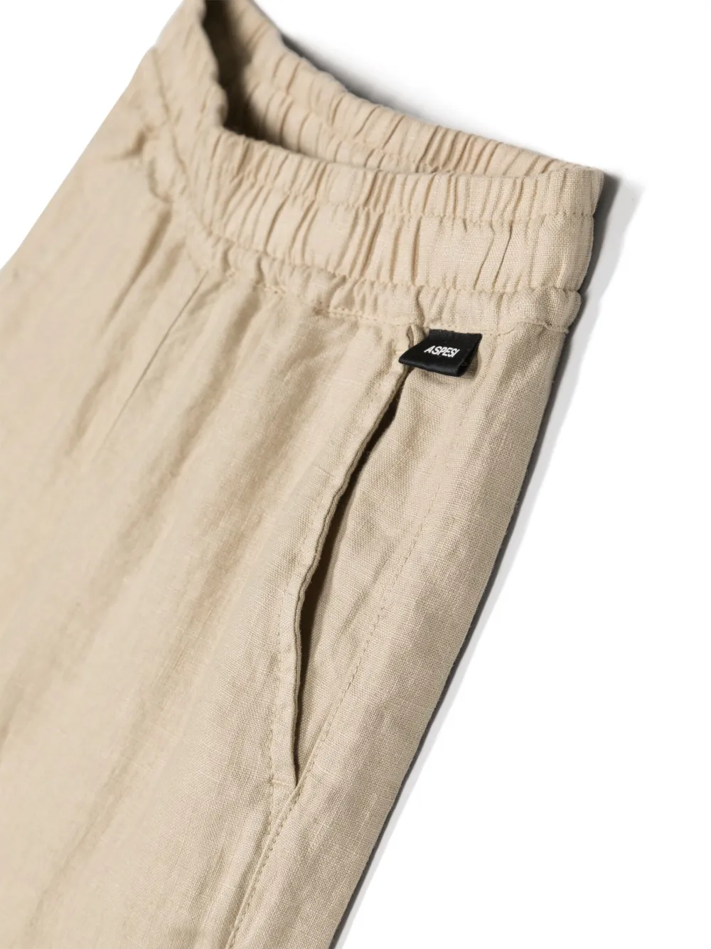 Бежевый, лен, маленькая подвеска с логотипом, эластичный пояс, прямой крой и два вшитых кармана по бокам. Этот товар как минимум на 50% состоит из материалов, которые признаны более безопасными для окружающей среды, и/или произведены с использованием методов, которые помогают сократить потребление воды и химических веществ.