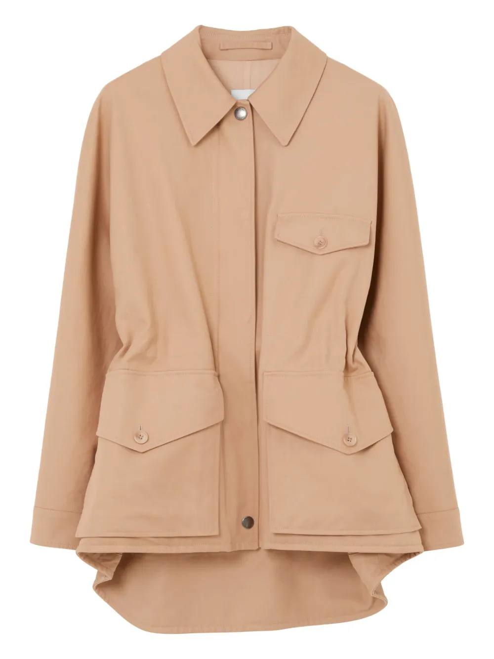 Бежевый, хлопок, классический воротник, потайная застежка спереди, длинные рукава, эластичный пояс, передние карманы с клапаном и неравномерный подол.