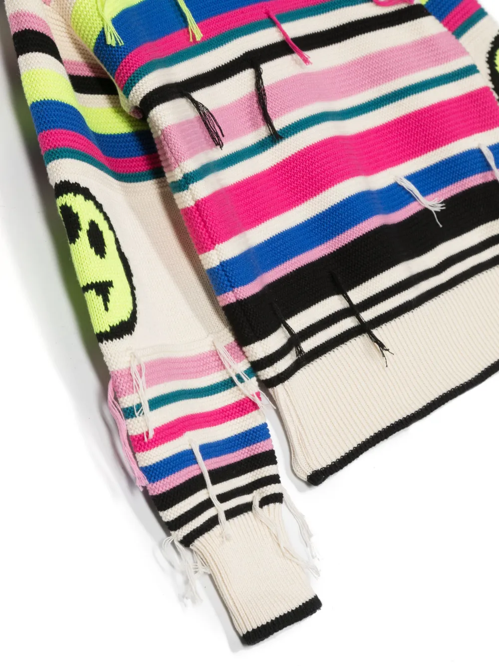 Трикотажный материал, бахрома, принт с изображением смайла, узор в горизонтальную полоску и маленькая подвеска с логотипом.