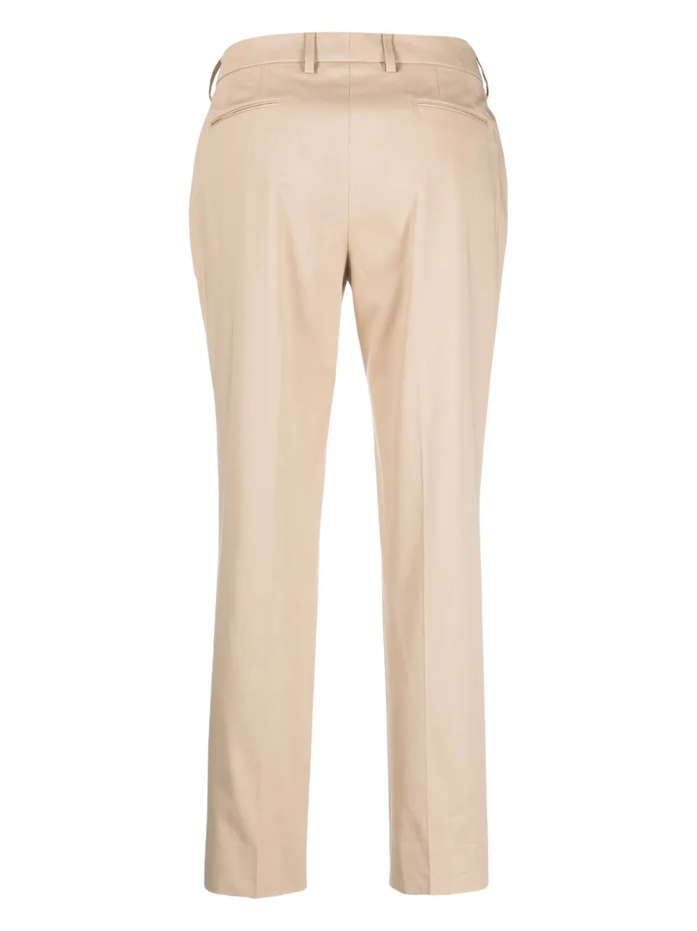 Светло-бежевый, эластичный хлопок, стрелки, петли для ремня, потайная застежка спереди, два вшитых кармана по бокам, два кармана с листочкой сзади и прямой крой.